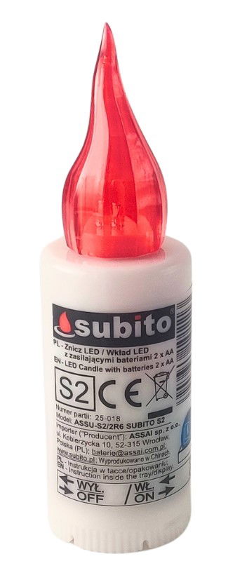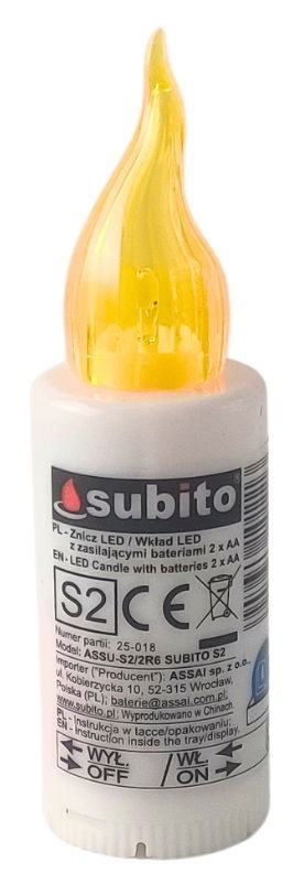 Klasyczny wkład LED do zniczy marki Subito zasilany bateriami R6. Pasuje do większości zniczy szklanych, plastikowych bądź różnego rodzaju kapliczek i latarenek. Wkład LED daje przyjemne światło, a bogaty wybór kolorów umożliwia stworzenie ciekawej iluminacji.