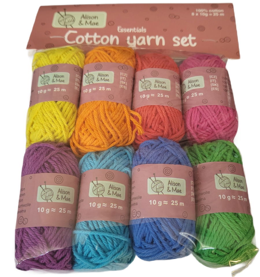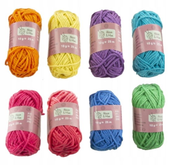 Zestaw włóczek bawełnianych w 8 pastelowych kolorach. Jest to bardzo miła i przyjemna w dotyku włóczka o długości 25 metrów w motku. Jest to zestaw miękkich i cienkich mini włóczek. Idealnie nadają się do szydełkowania, robótek na drutach, frywolitki i makramy oraz do wszystkich prac dziewiarskich i kreatywnych. Zalecany rozmiar drutów to 2,5 i 3. Doskonałe na wyroby dla dzieci. Można je prać w pralce w temperaturze do 30 °C. Skład to 100% bawełna. Zestaw włóczek waży 80 g (10 g każdy motek).