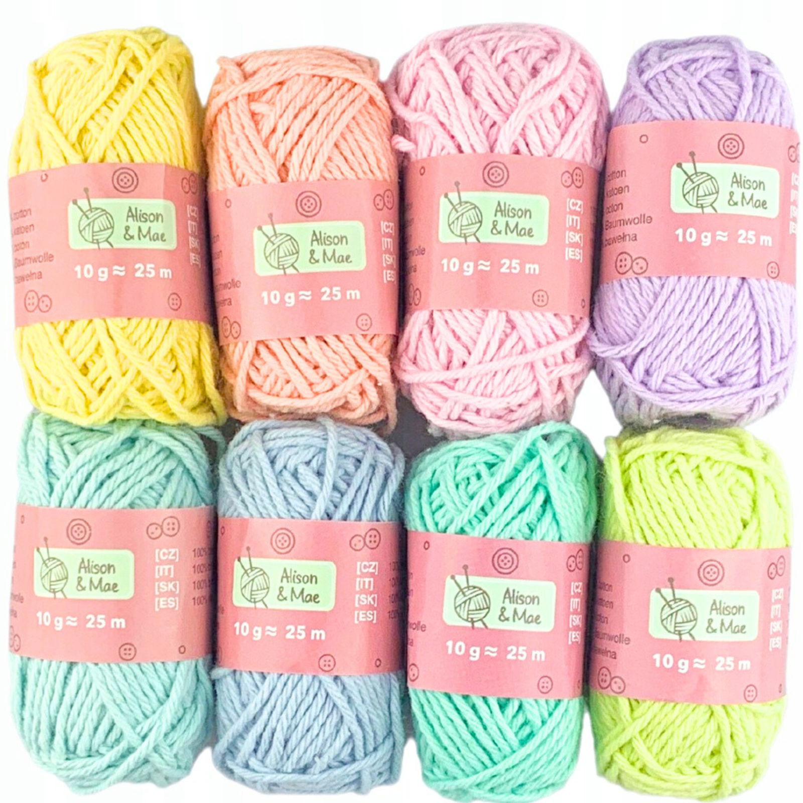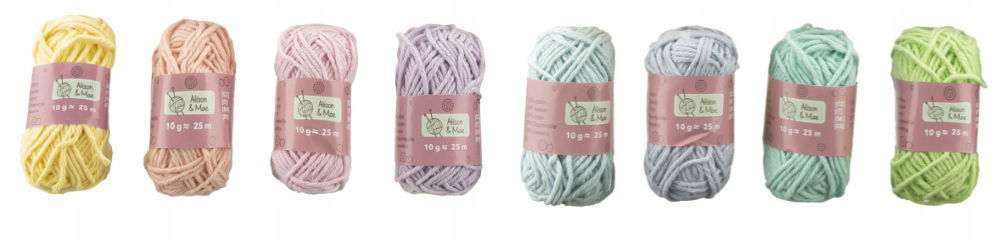 Zestaw włóczek bawełnianych w 8 pastelowych kolorach. Jest to bardzo miła i przyjemna w dotyku włóczka o długości 25 metrów w motku. Jest to zestaw miękkich i cienkich mini włóczek. Idealnie nadają się do szydełkowania, robótek na drutach, frywolitki i makramy oraz do wszystkich prac dziewiarskich i kreatywnych. Zalecany rozmiar drutów to 2,5 i 3. Doskonałe na wyroby dla dzieci. Można je prać w pralce w temperaturze do 30 °C. Skład to 100% bawełna. Zestaw włóczek waży 80 g (10 g każdy motek).