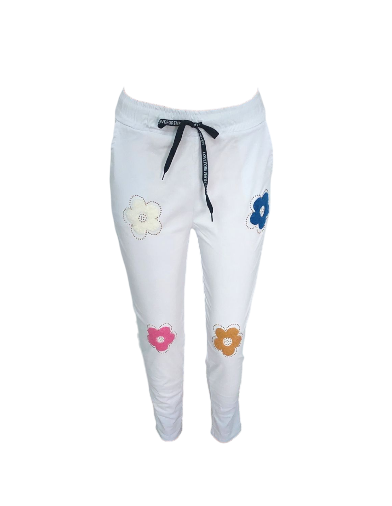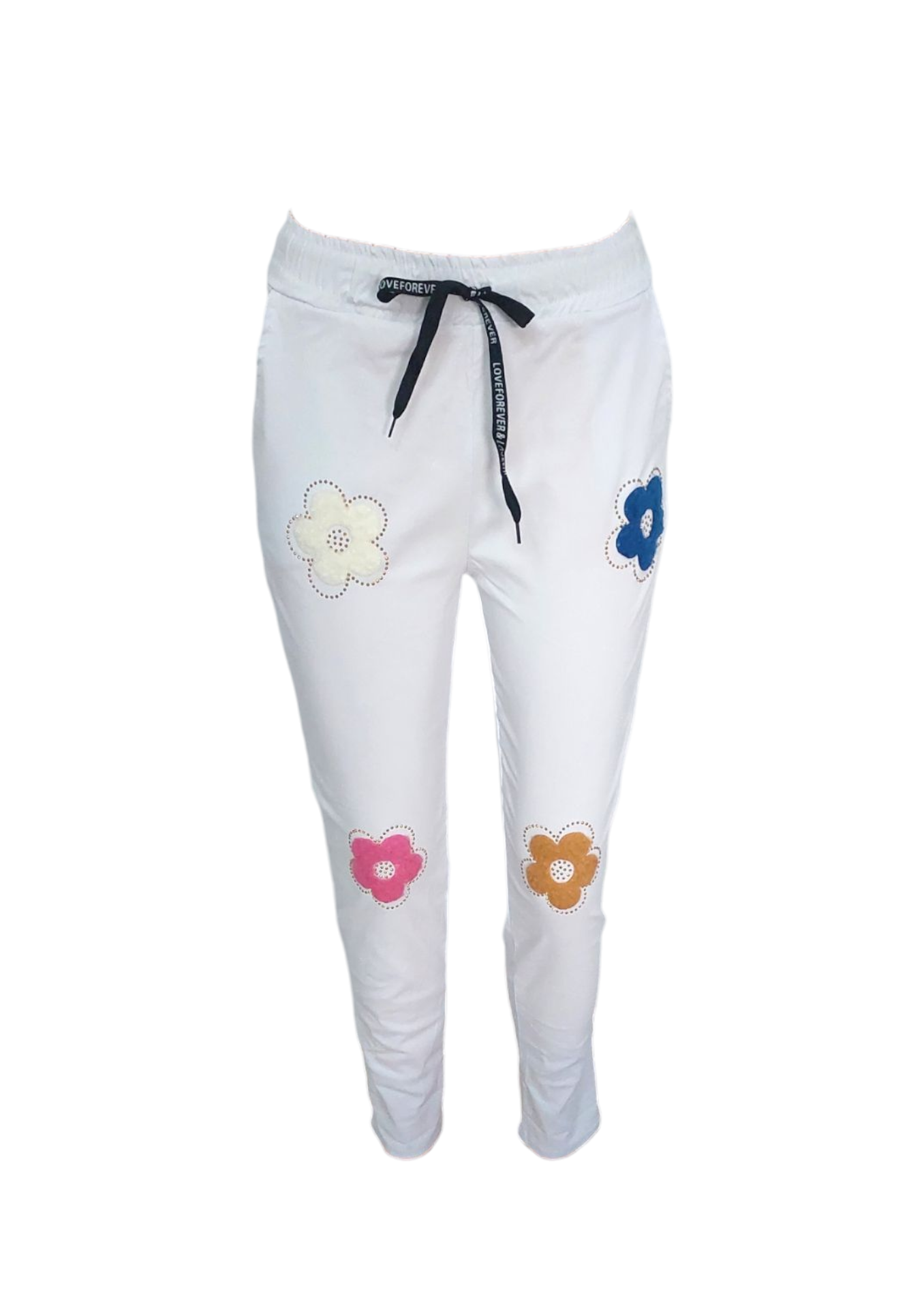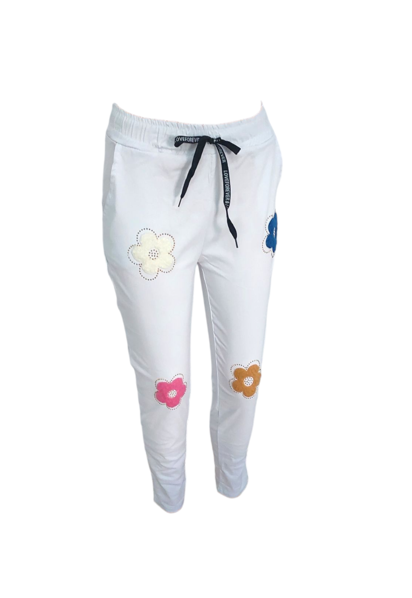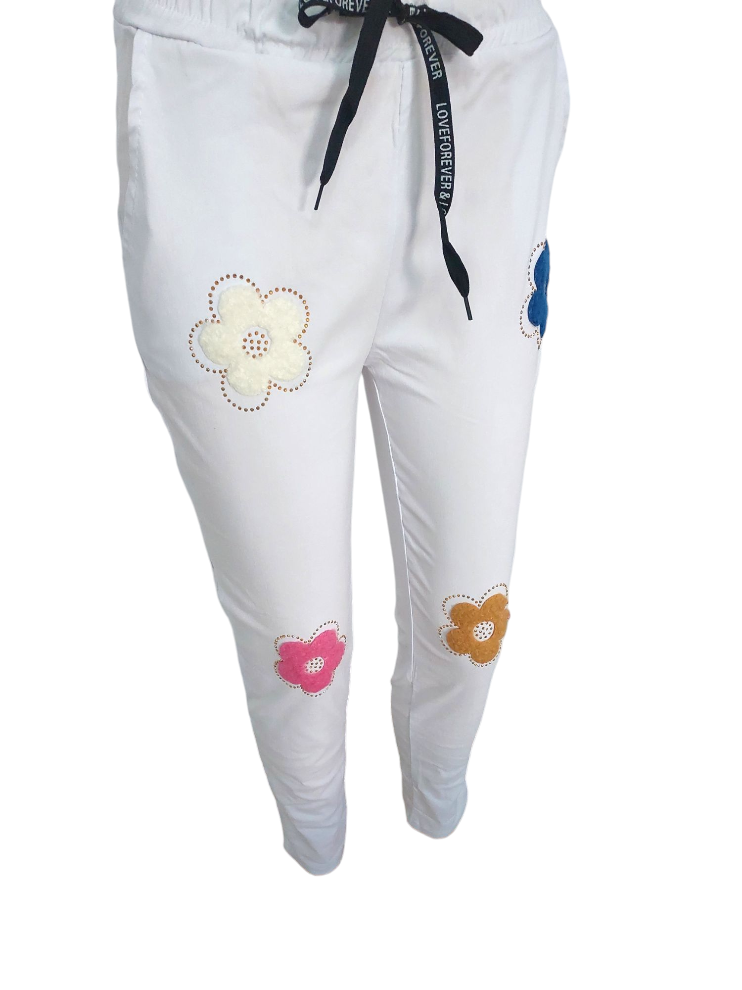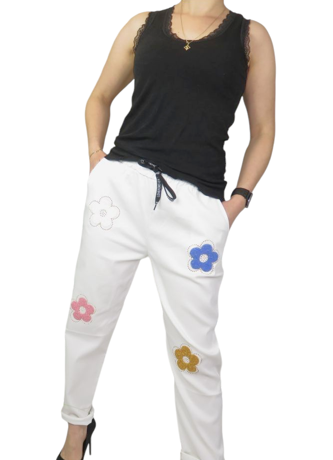 Bardzo wygodne i elastyczne włoskie spodnie. Po bokach posiadają kieszenie. W pasie gumka i dodatkowo troczek do regulacji. Spodnie mają dopasowany fason, podkreślający sylwetkę. Idealne na wiosenne spacery czy wieczorne wyjścia. Kwiatuszkowy wzór nadaje im dziewczęcego uroku i lekkości. Doskonale sprawdzą się w stylizacjach casualowych, ale także na bardziej eleganckie okazje.