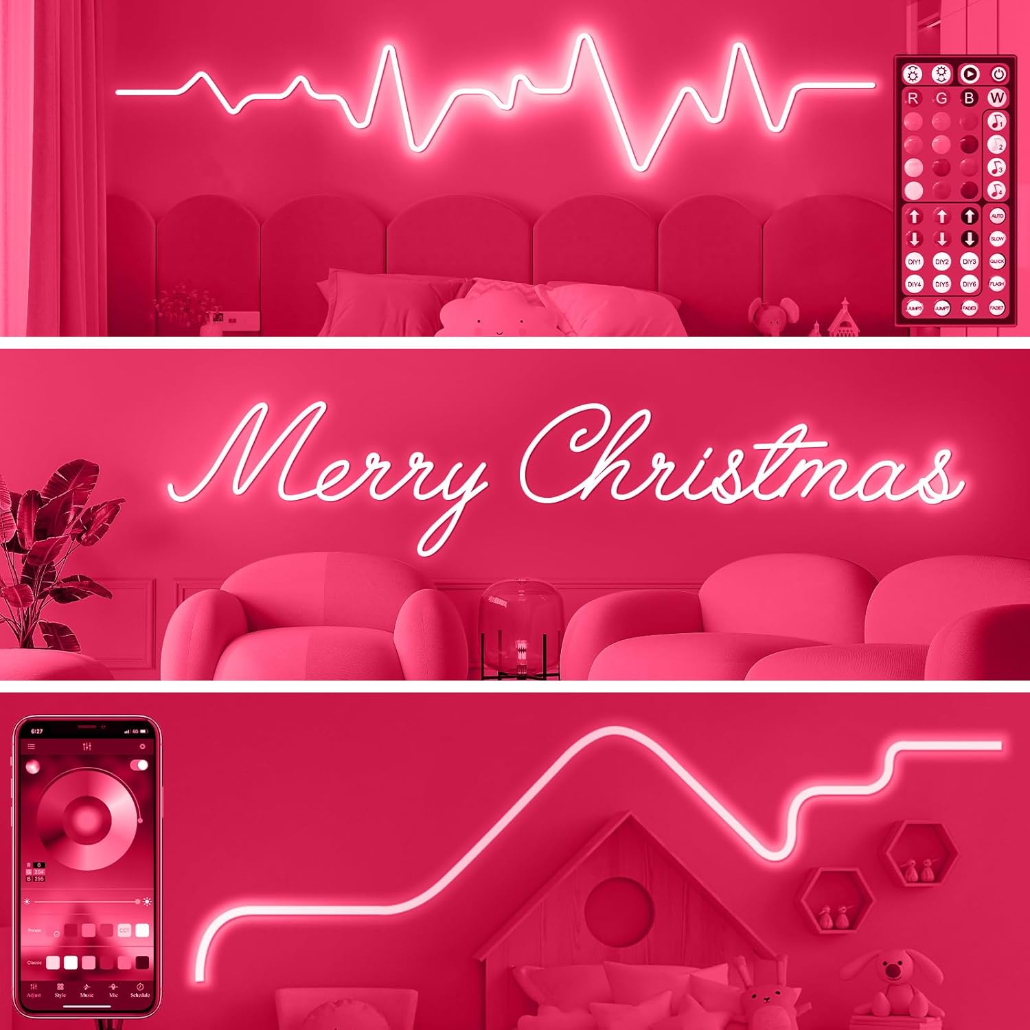 - Inteligentna neonowa taśma LED RGB Bluetooth: oferuje sterowanie za pomocą Bluetooth (aplikacja), pilota RF oraz wbudowanego mikrofonu. Umożliwia synchronizację światła z muzyką oraz posiada funkcję timera. Do dyspozycji jest aż 16 milionów kolorów, a także różnorodne tryby automatyczne, funkcje muzyczne, mikrofonowe i alarmowe.