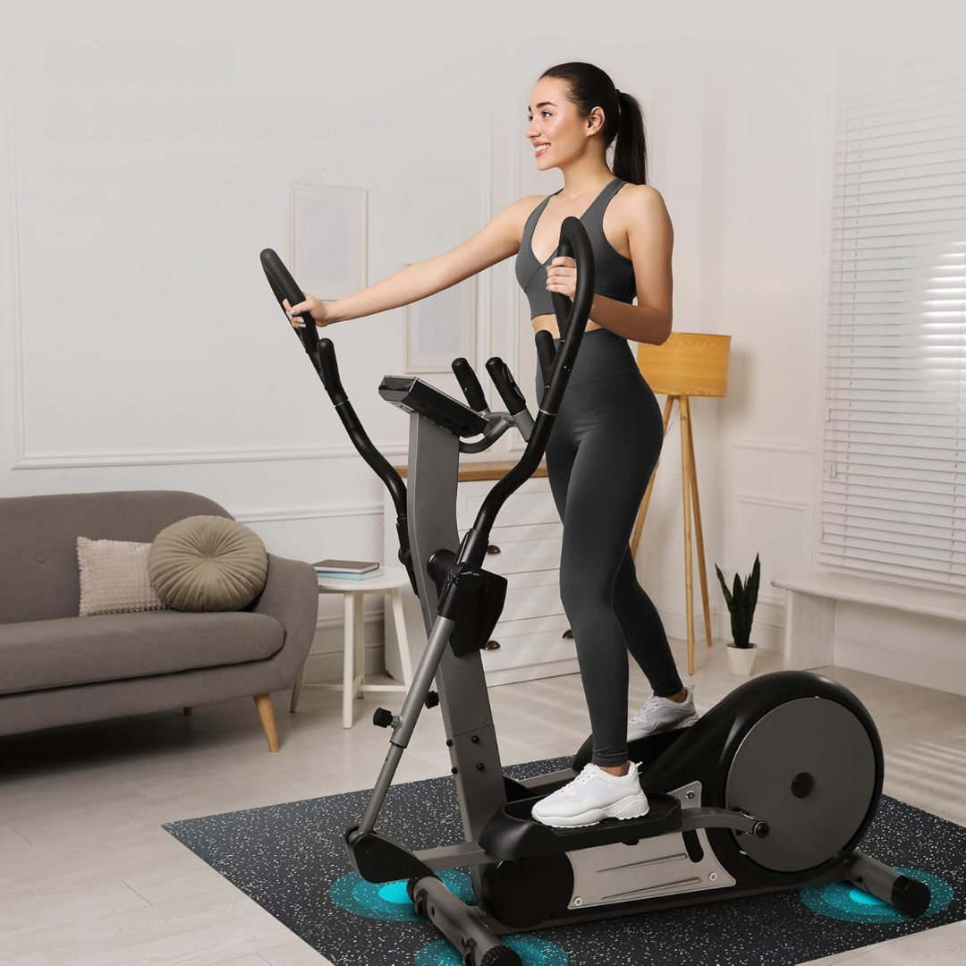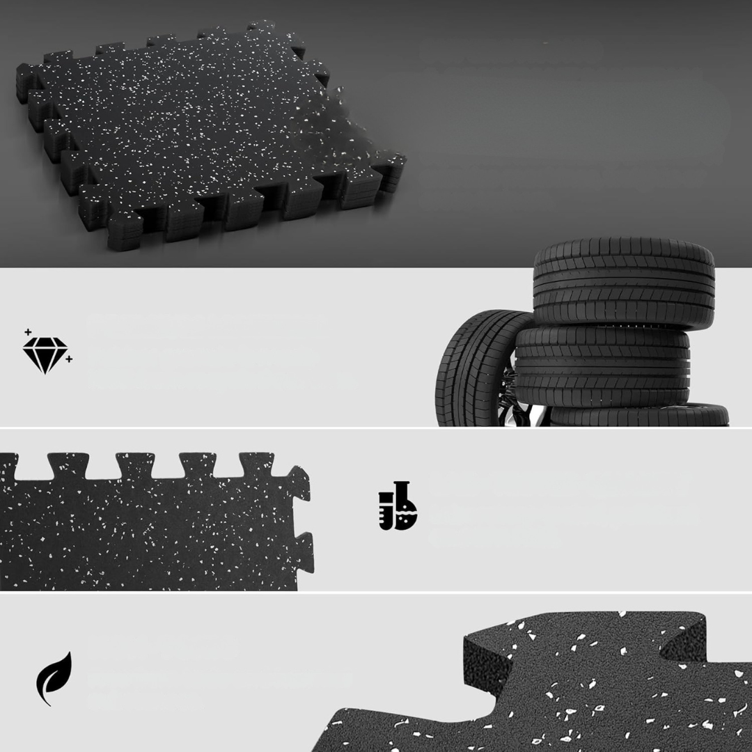 - Materiał premium: granulki gumowe powstają w 100% z recyklingowanych opon samochodowych. Zastosowano wyjątkowo wytrzymały, odporny materiał, odpowiedni do użytku z ciężkim sprzętem treningowym, maszynami do ćwiczeń, ciężarami oraz trenażerami. Maty zostały przebadane laboratoryjnie pod kątem bezpieczeństwa — nie zawierają toksycznych ani szkodliwych substancji, w tym BPA. Dzięki temu znajdują zastosowanie w przestrzeniach domowych, takich jak sale zabaw czy strefy fitness, zapewniając wysoki poziom ochrony i komfortu użytkowania.