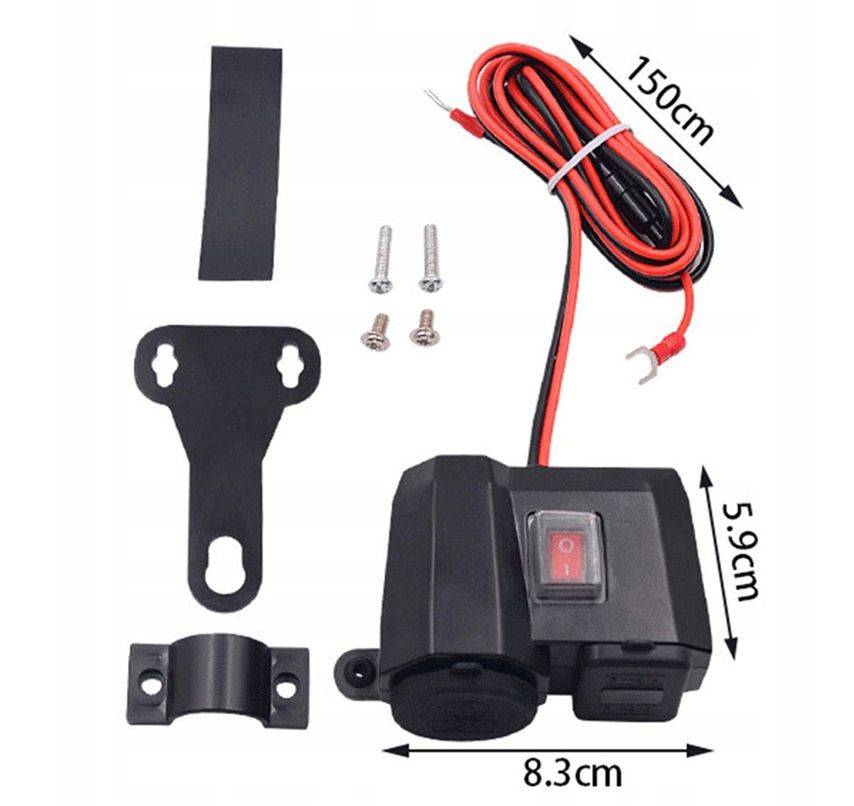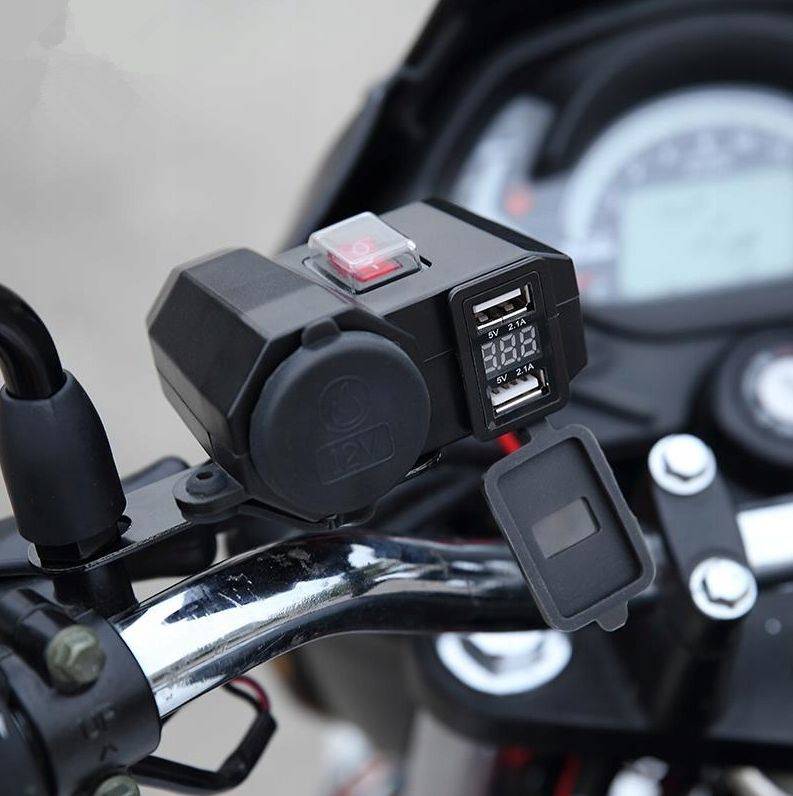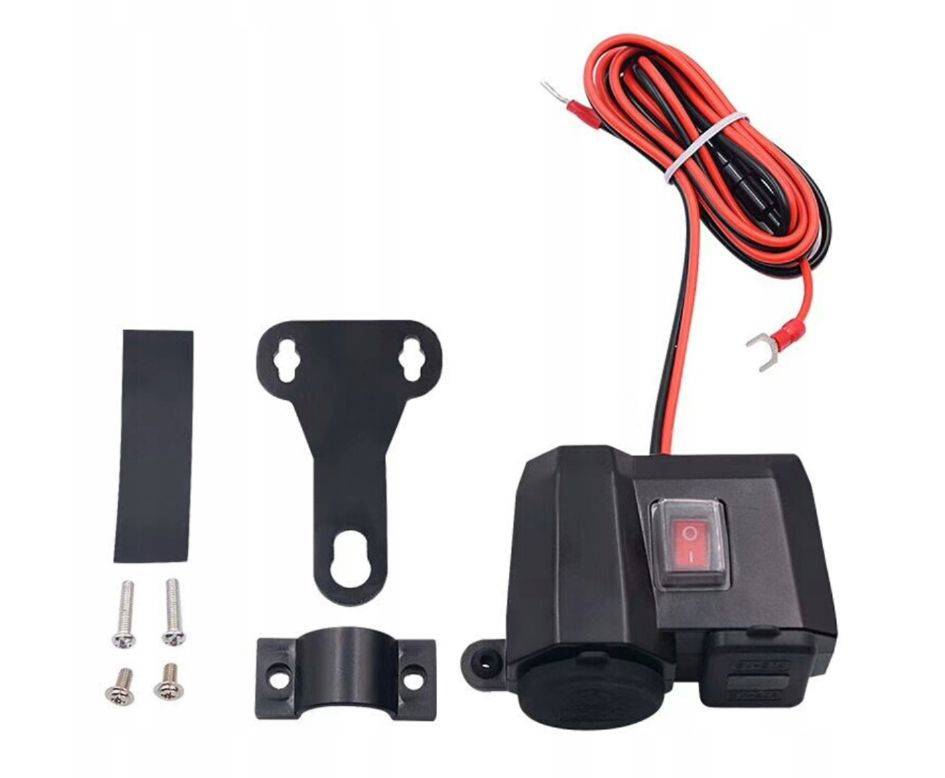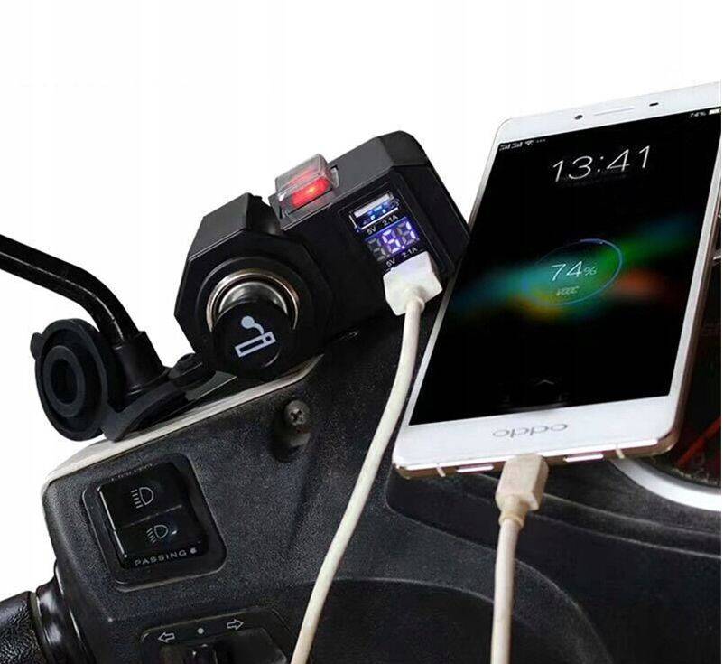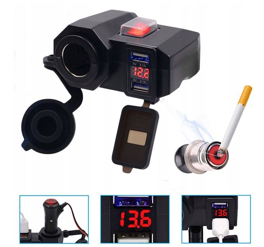 Wodoodporne gniazdo zapalniczki do motocykla, skutera, quada. Wyposażone w woltomierz pokazujący napięcie ładowania akumulatora. Dodatkowo dwa mocne porty USB 5V 2.1A.