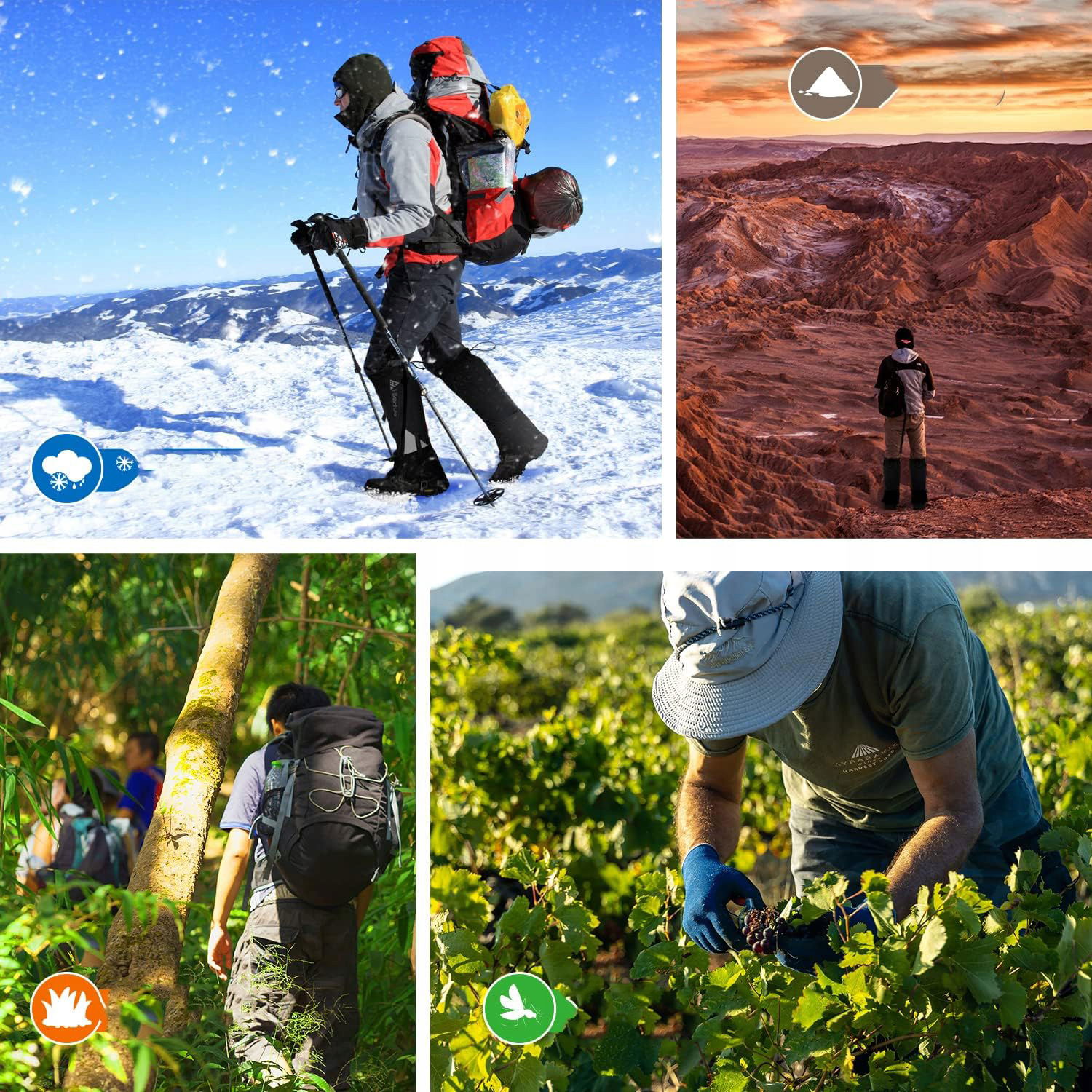 - Zastosowanie: ochrona przed śniegiem, deszczem, błotem, kamieniami i owadami podczas aktywności outdoorowych