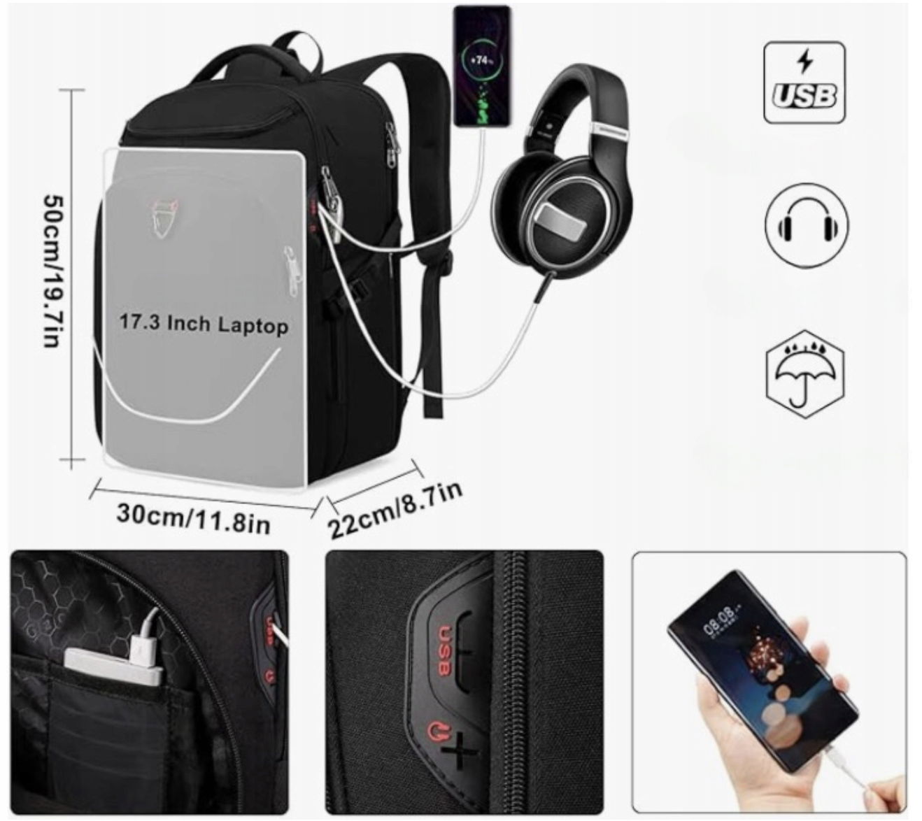 Z gniazdem USB i otworem na słuchawki, plecak USB zapewnia łatwiejszy sposób ładowania telefonu i słuchania muzyki bez użycia rąk podczas spacerów, wędrówek lub jazdy na rowerze.