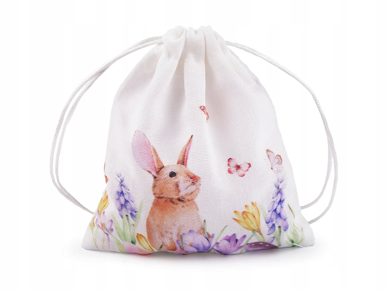 Uroczy woreczek wykonany z wysokiej jakości bawełny, ozdobiony delikatnym nadrukiem przedstawiającym wiosenne kwiaty, motylki oraz sympatycznego króliczka. Jego jasna, elegancka kolorystyka i subtelny wzór nadają mu wyjątkowego uroku, idealnego na Wielkanoc i nie tylko!