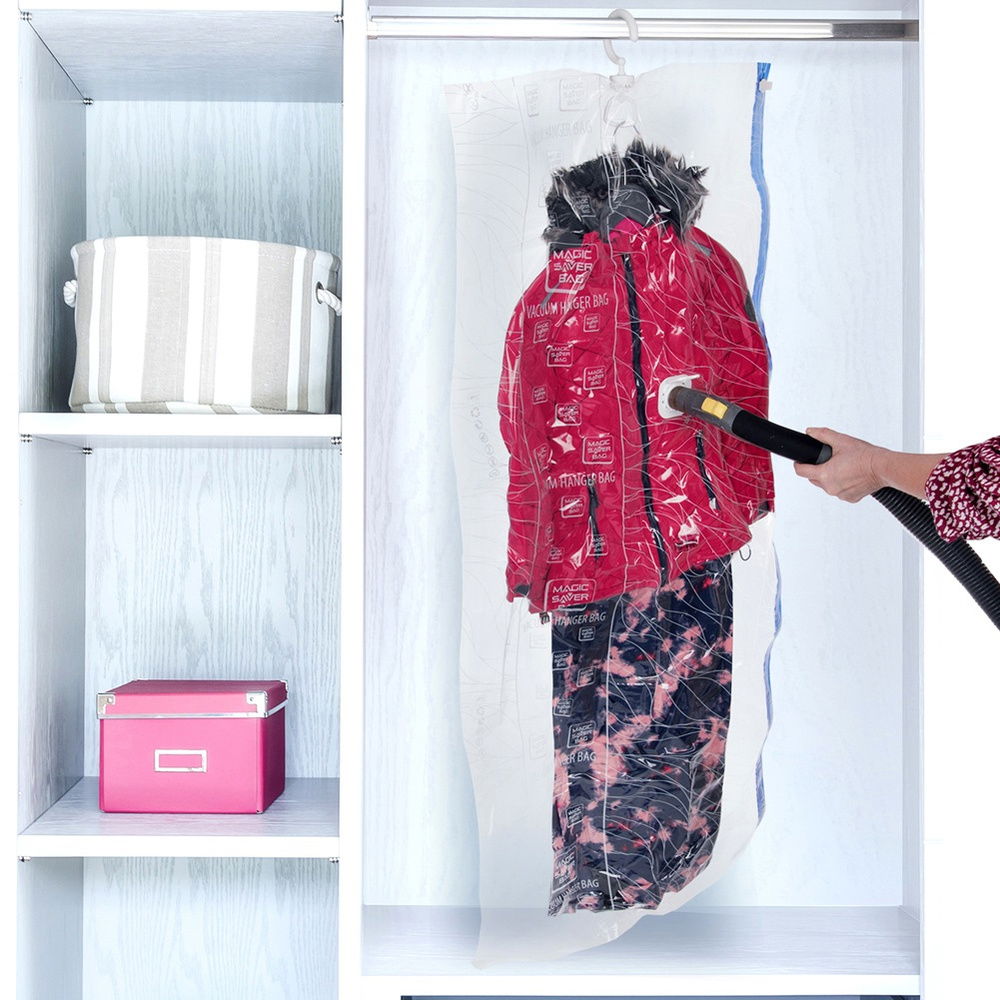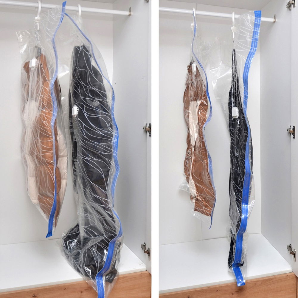 Oszczędność miejsca dzięki odsysaniu powietrza - Z wypełnionego worka rzeczami zasysamy powietrze za pomocą odkurzacza lub pompy ssącej, dzięki czemu zmniejszamy objętość worka i zyskamy na przestrzeni. Dzięki usunięciu nadmiaru powietrza możemy zaoszczędzić do 75% miejsca. Bardzo przydatny podczas podróży bądź przeprowadzki.