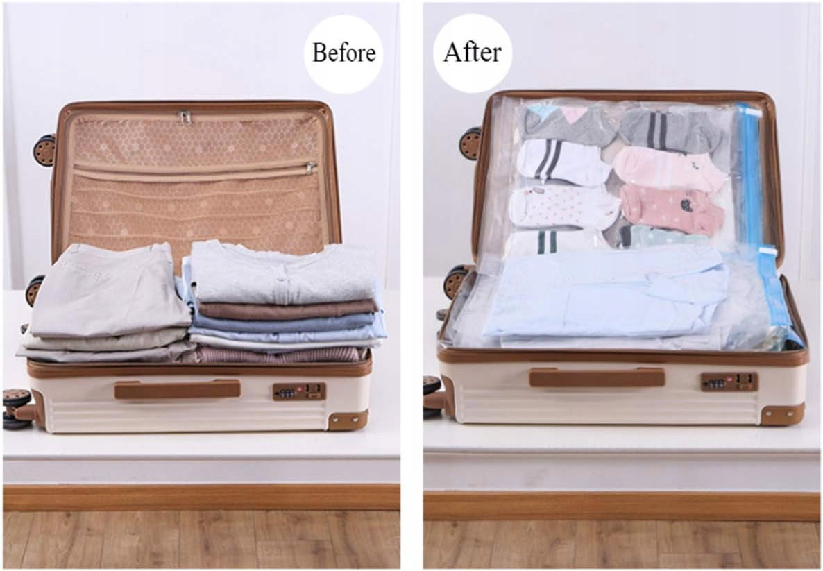 - Oszczędność miejsca: zestaw zawiera 12 worków próżniowych wielokrotnego użytku w dwóch rozmiarach (6szt 35 × 50 cm oraz 6szt 40 × 60 cm). Umożliwiają redukcję objętości nawet o 80%, co ułatwia przechowywanie ubrań, pościeli, ręczników, koców czy poduszek oraz oszczędza miejsce w walizce.