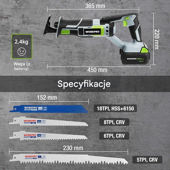 - Zawartość opakowania: 1 x piła szablasta WORKPRO, 1 x akumulator 20 V 4000 mAh, 1 x szybka ładowarka, 1 x instrukcja obsługi, 4 x brzeszczoty: 230 x 19 x 1,3 mm, 5T (drewno), 1 szt. 152 x 19 x 1,2 mm, 6T (drewno), 1 szt. 6 cali. 152 X 19 x 1,2 mm 8T (drewno), 1 sztuka 150 x 16 x 0,9 mm 18T (metal).