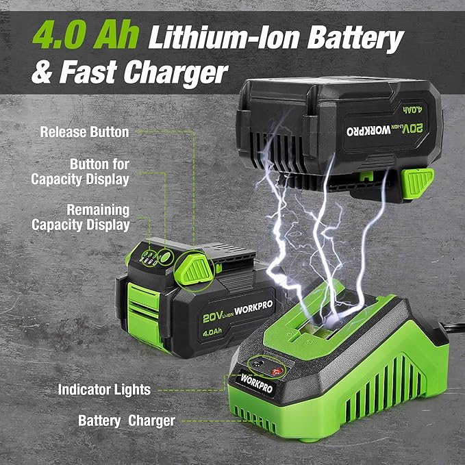 - 【Długi czas pracy i szybka ładowarka】Wyposażony w akumulator litowo-jonowy 4,0 Ah. Praca bez kabla staje się bezpieczniejsza i wygodniejsza. Szybka ładowarka umożliwia pełne naładowanie akumulatora w ciągu jednej godziny. Urządzenie może następnie pracować nawet przez 50 minut. Wskaźnik baterii pokazuje pozostały poziom naładowania baterii.