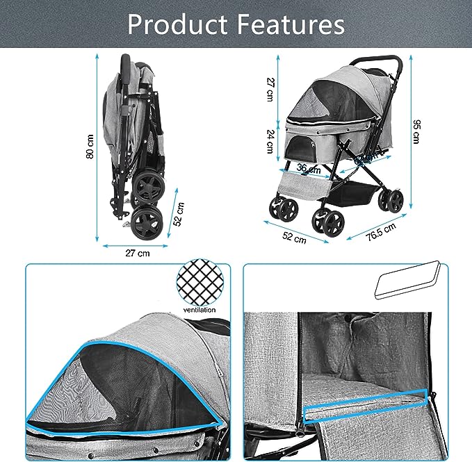 - Solidny i dobrze wykonany: rama wózka wykonana jest z wysokiej jakości, wytrzymałej stali, która jest odporna na zginanie i może pomieścić małe zwierzęta do około 20 kg. Wyposażony w wodoodporną tkaninę oxford 600D, która jest odporna na gryzienie i zarysowania.