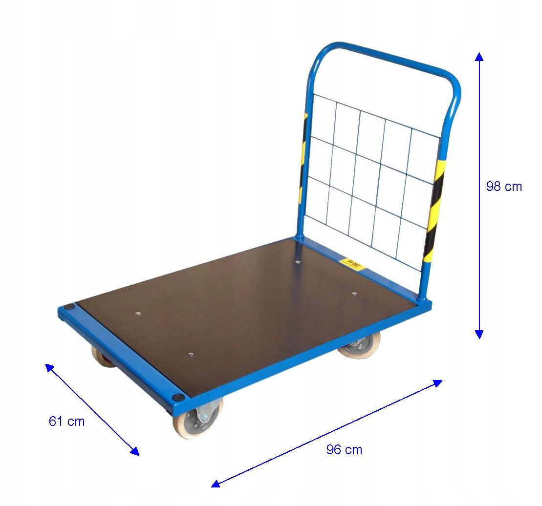 Polecamy wózek platformowy malowany proszkowo na kolor niebieski. Platforma z płyty laminowanej, antypoślizgowej - wodoodpornej. o wymiarach 96x61cm.Wózek na kołach pełnych o średnicy 16 cm. Cztery kółka w tym dwa obrotowe. Posiadamy w ofercie kółka, także jeśli zajdzie taka potrzeba można je bez problemu dokupić. Nośność wózka to 400 kg.Na czas transportu rączka odkręcana. Koła zamontowane. Wózek solidnie wykonany, spawany. Rączka przykręcana od spodu na śruby. Wózek do transportu kartonów. pojemników, skrzynek. Produkt Polski na polskich podzespołach.