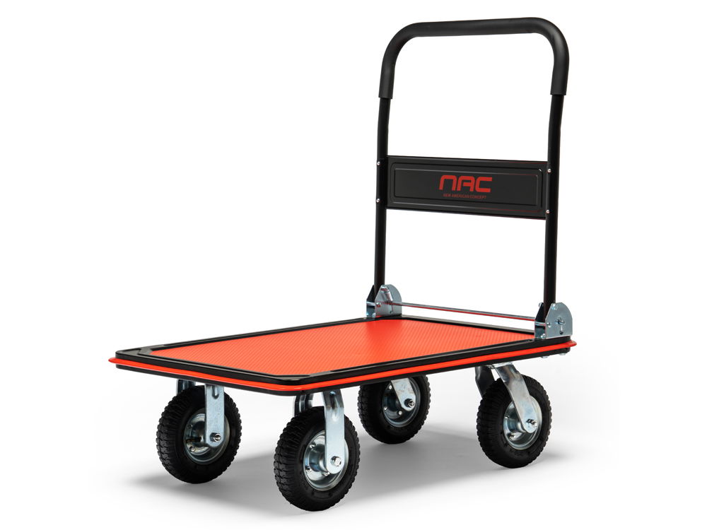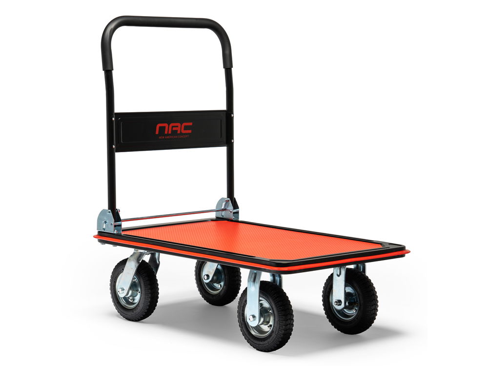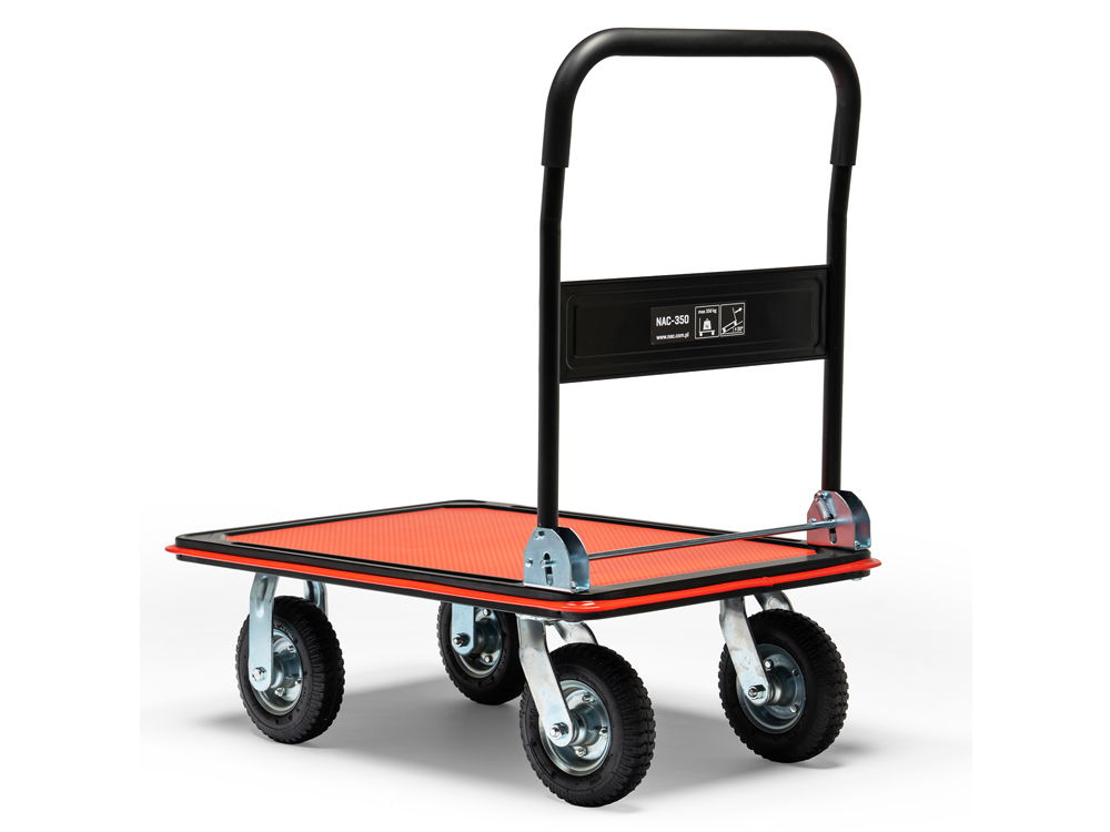 Wózek magazynowy platformowy renomowanej firmy NAC , przeznaczony do przewożenia ładunków o maksymalnej wadze do 350 kg.