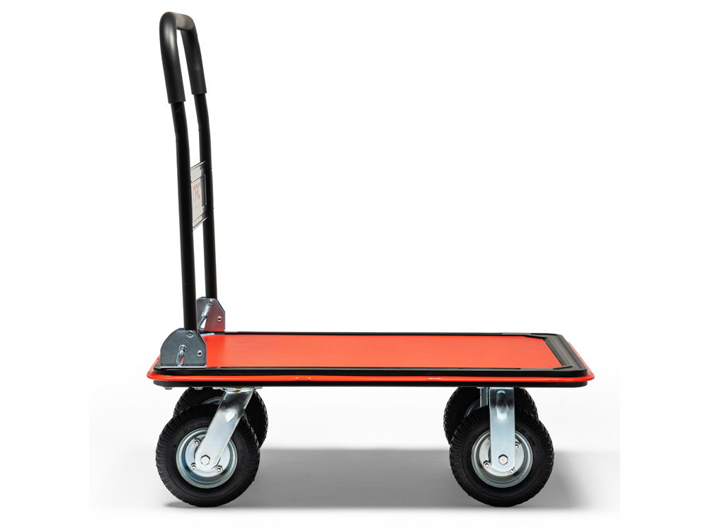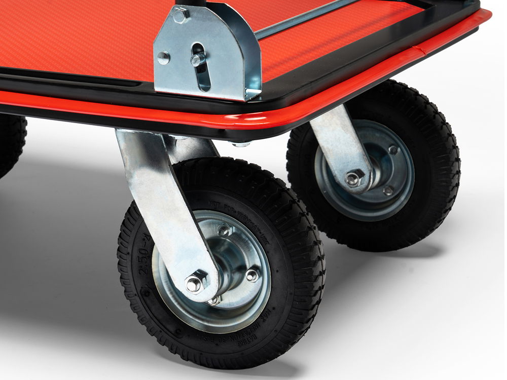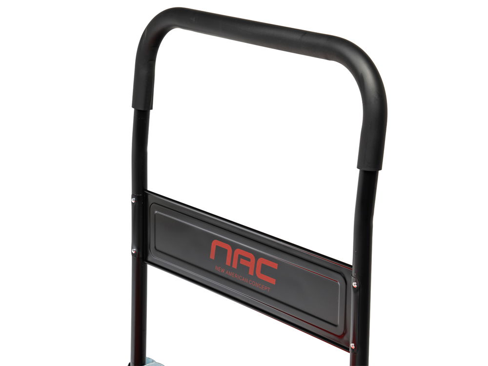 Wózek posiada składaną rączkę, którą w każdej chwili można złożyć naciskając nogą na sprężynową blokadę. Tylne koła mają możliwość wykonania pełnego obrotu 360°, aby w pełni kontrolować wózek podczas prowadzenia. Urządzenie zyskuje na manewrowości zwłaszcza w wąskich alejkach magazynowych.