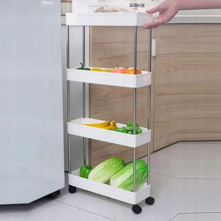 - Kompaktowy Design: Wąska półka, szeroka na zaledwie 13 cm, idealnie mieści się w wąskich przestrzeniach, takich jak miejsce pomiędzy pralką a ścianą, czy lodówką.
