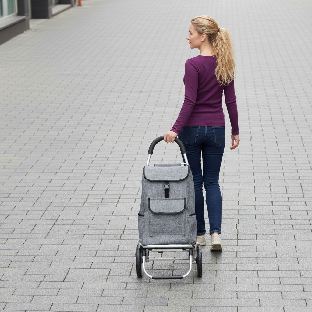 - Wózek prowadzi się lekko i płynnie, a pojemna torba z usztywnionym dnem bezpiecznie przechowuje zakupy.