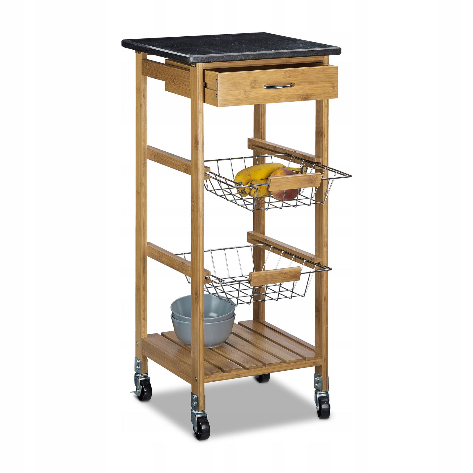 - Wózek kuchenny z szufladą z ogranicznikiem (rozmiar wewnętrzny: 5,5 x 26,5 x 26,5 cm) - 2 wysuwane kosze ze stali nierdzewnej z drewnianymi uchwytami na owoce, warzywa itp. - Rozmiar: ok. 6,5 x 25 x 29 cm