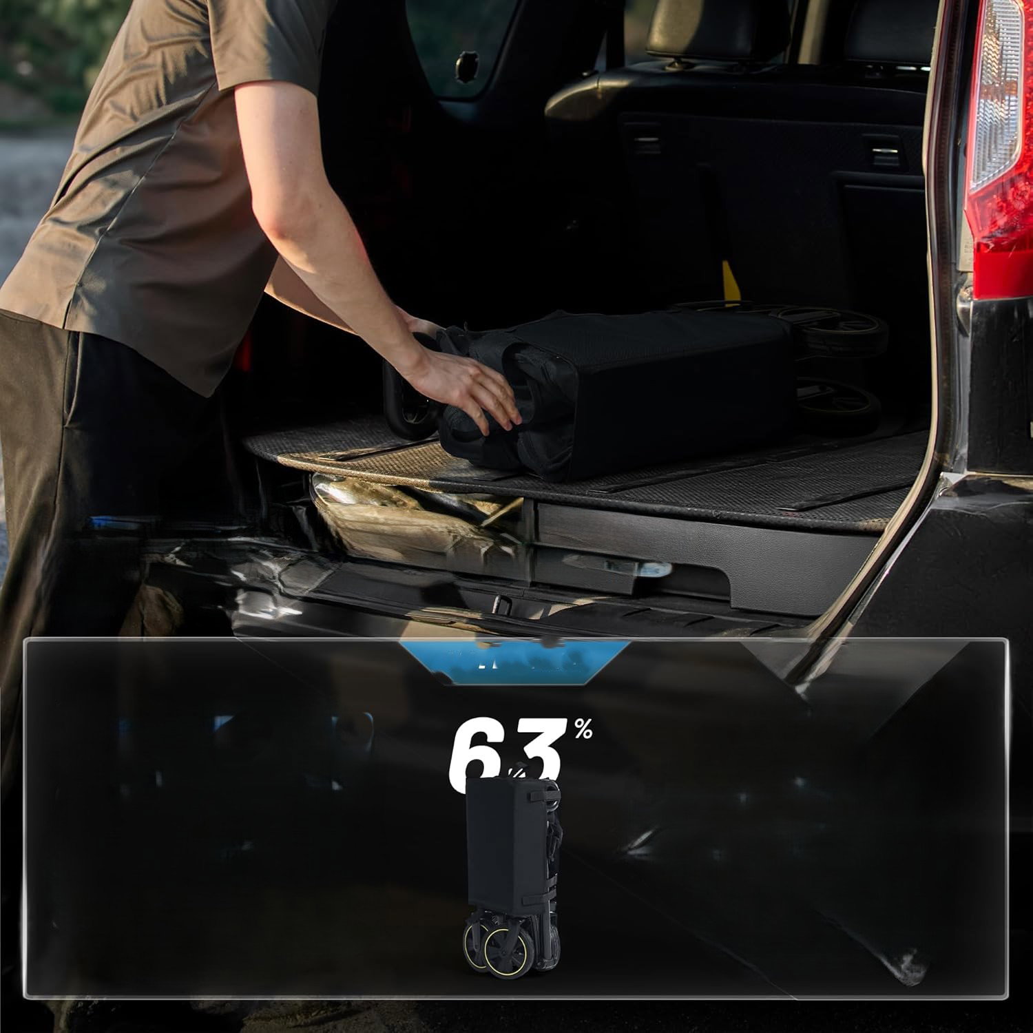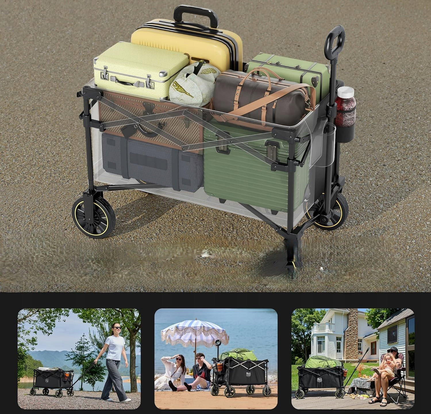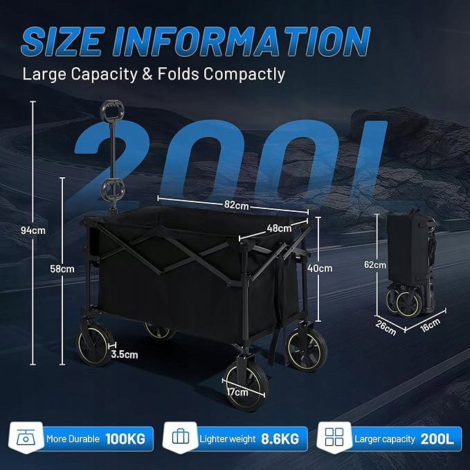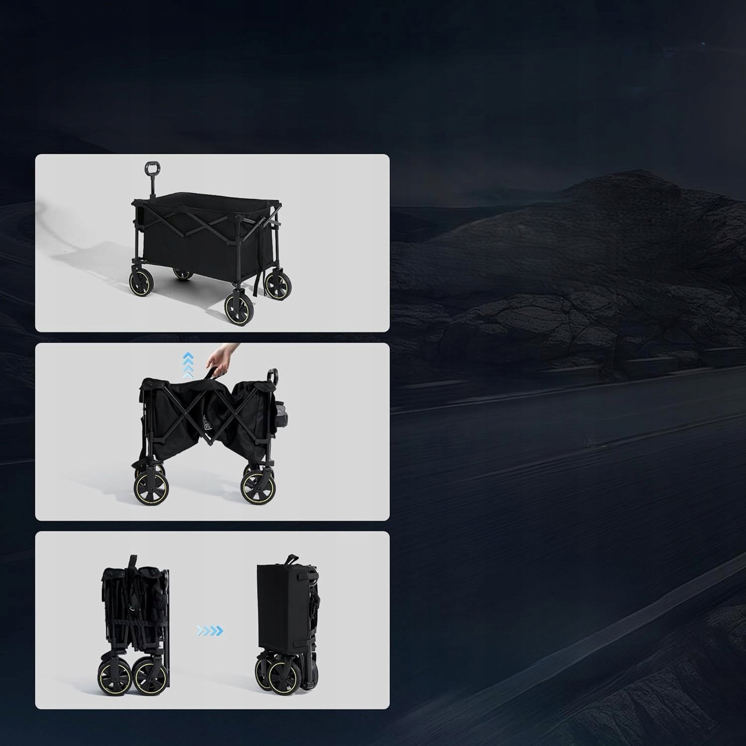 Dzięki przemyślanej konstrukcji wózek można szybko złożyć w kilka sekund. Po złożeniu zajmuje niewiele miejsca, co ułatwia jego przechowywanie i transport. Dodatkowy uchwyt na napoje zwiększa komfort użytkowania podczas dłuższych wyjazdów. Idealny do zastosowań w ogrodzie, na kempingu, podczas zakupów, festiwali czy wyjazdów na plażę.
