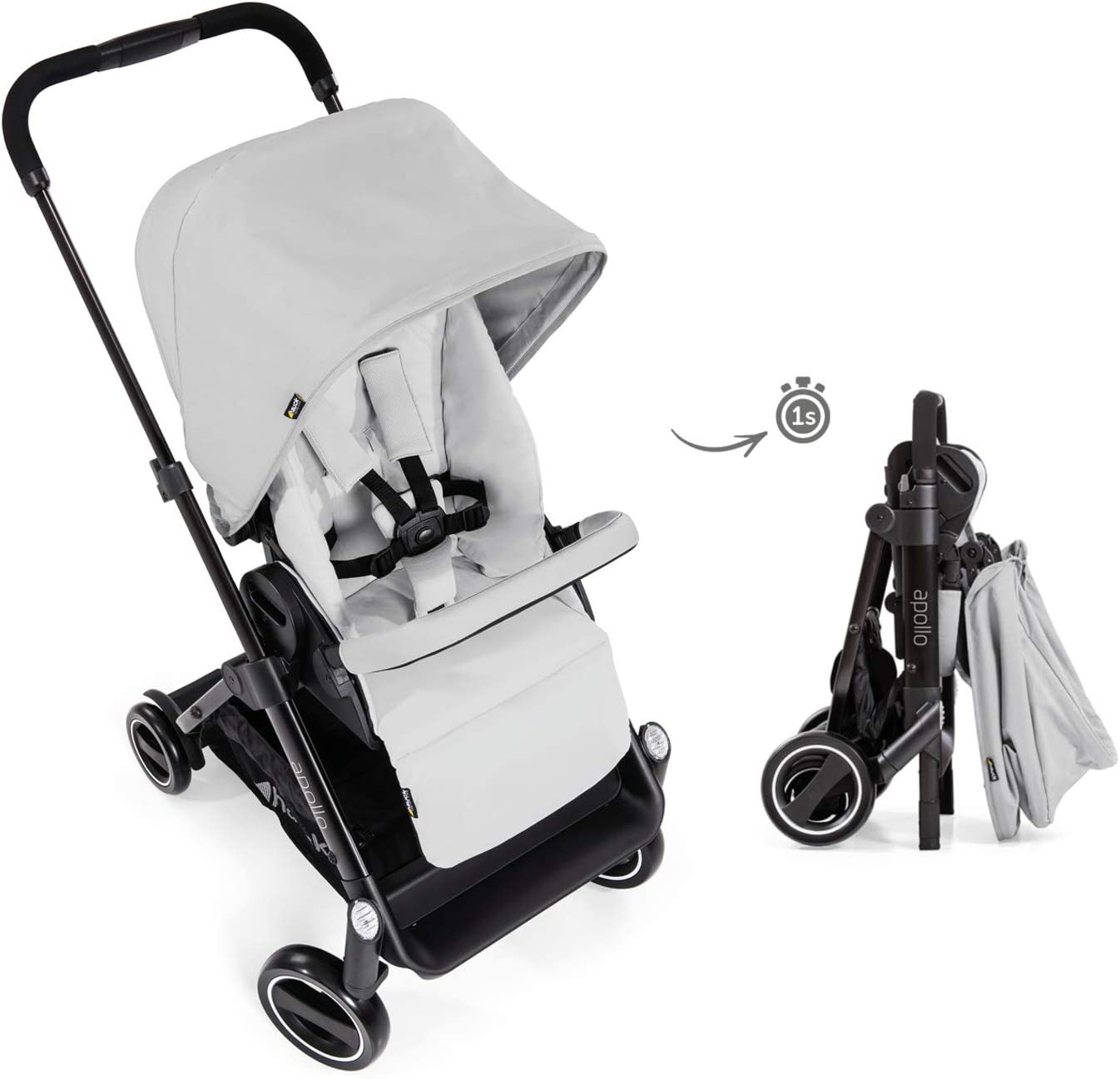 Oparcie wózka można łatwo ustawić w pozycji leżącej, a podnóżek regulowany jest nawet jedną ręką. Szczególnie duża powierzchnia do siedzenia i leżenia zapewnia optymalną przestrzeń na główkę i nogi, podczas gdy daszek może być zaciągnięty do przodu. Siedzisko ustawiane jest w obu kierunkach. Ponadto wózek Apollo może być używany przez bardzo długi czas, ponieważ odpowiedni jest dla dzieci o wadze aż do 25 kg.