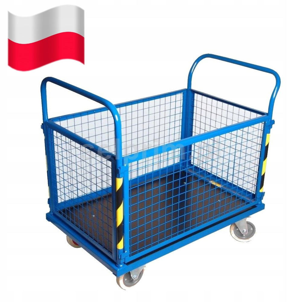 Polecamy wózek platformowy osiatkowany z 4 stron malowany proszkowo na kolor niebieski RAL 5010. Boki wózka zabudowane siatką (wysokość 500 mm). Wszystkie burty w wózku można zdjąć razem z rączką. Wzmocniona przestrzeń ładunkowa wózka wypełniona została wodoodporną, antypoślizgową sklejką o grubości 12 mm. Platforma o wymiarach 76x48 cm. Koła pełne (szara niebrudząca guma) o średnicy 160 mm-2 stałe i 2 obrotowe- gwarantuje komfort pracy na równych powierzchniach. W wózku występują dwie rączki do prowadzenia jedna prosta, druga wygięta - wystaje ona 20 cm na zewnątrz zwiększając wymiar całkowity wózka. Posiadamy w ofercie kółka, także jeśli zajdzie taka potrzeba można je bez problemu dokupić. Nośność wózka to 400 kg. Na czas transportu rączka i burty wózka są zdemontowane. Koła zamontowane. Wózek do transportu kartonów. pojemników, skrzynek, worków, paczek. Wózek to zakup na lata. Produkt Polski na polskich podzespołach.