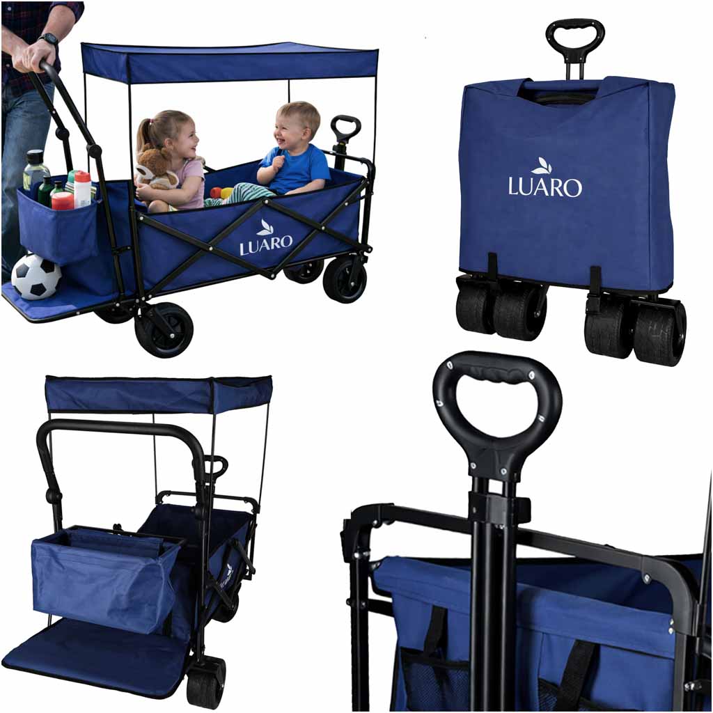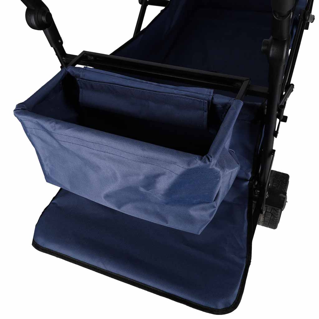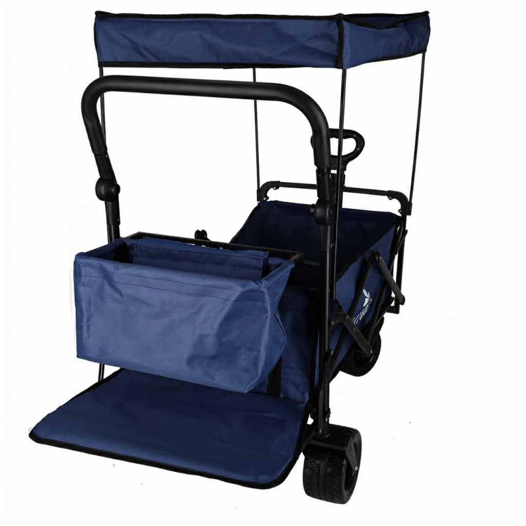TERENOWE KOŁA I PEŁNA KONTROLA - Szerokie koła typu Tank Wheel oraz skrętne przednie kółka gwarantują płynne prowadzenie na piasku, trawie i nierównym podłożu. Regulowane uchwyty pozwalają wygodnie pchać lub ciągnąć wózek w zależności od potrzeb.