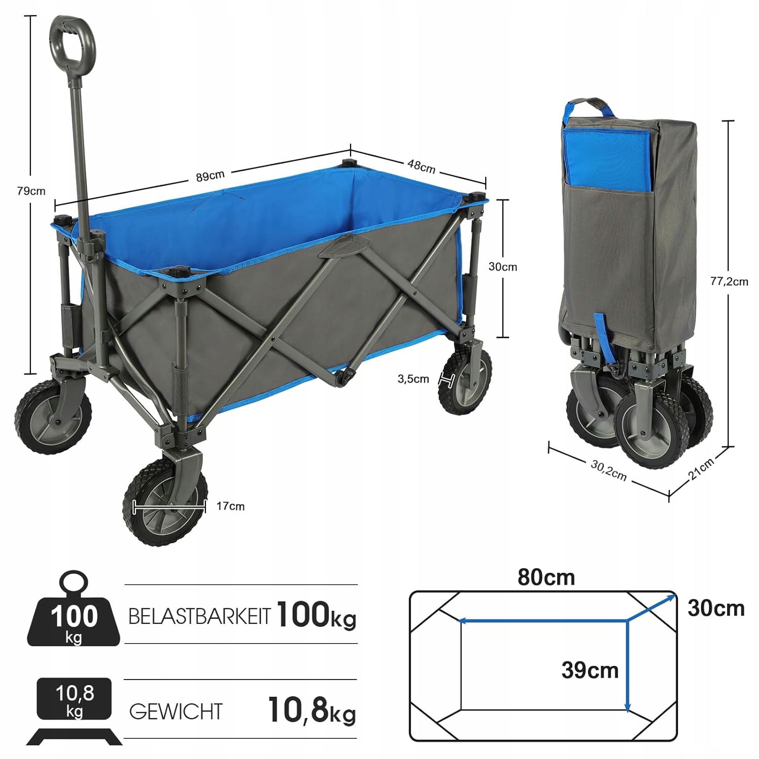 - Zabierz ze sobą i przechowuj: nie wymaga montażu. Konfiguracja i składanie w ciągu kilku sekund. Duży rozmiar wewnętrzny wózka Portal wynosi 100 l. Jednak dzięki rozmiarowi po złożeniu 77 x 30 x 21 cm wózek transportowy można łatwo zabrać ze sobą. Można go również przechowywać w szafie, garażu lub w bagażniku każdego standardowego samochodu.