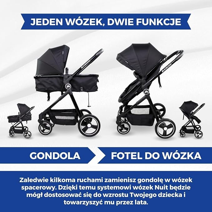 DESIGN 2 W 1 I PRAKTYCZNE AKCESORIA: Wózek dziecięcy , dzięki swojemu projektowi ewolucyjnemu 2 w 1, przekształca się z gondoli na wózek, zapewniając komfort we wszystkich etapach wzrostu dziecka i obsługując do 22 kg
