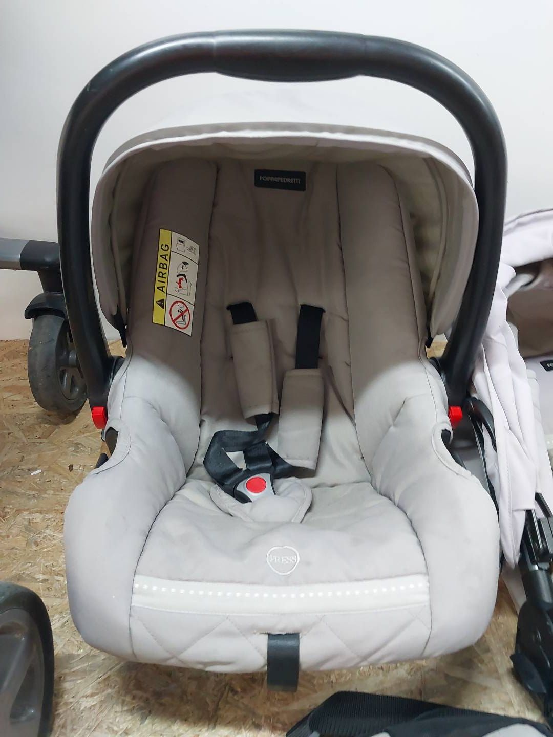 FOTELIK SAMOCHODOWY: Zatwierdzony dla grupy 0+, od urodzenia do 13 kg (około 15 miesięcy). Można go łatwo przymocować do ramy za pomocą wygodnego systemu zaczepiania/odczepiania. Siedzisko anatomiczne. Wyposażony w zdejmowaną budkę przeciwsłoneczną i wewnętrzny reduktor na pierwsze miesiące. Może służyć jako kołyska z systemem bujanym oraz jako nosidełko. Posiada wygodny regulowany uchwyt ułatwiający transport.