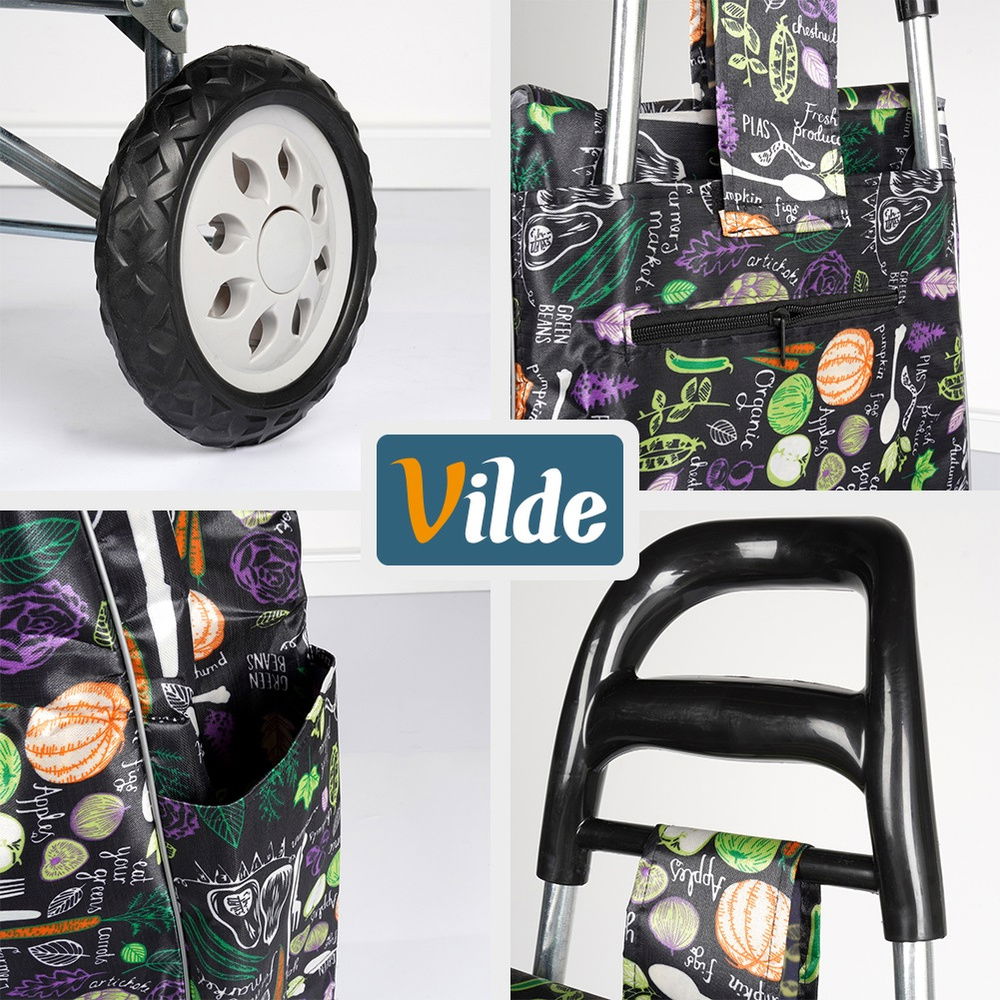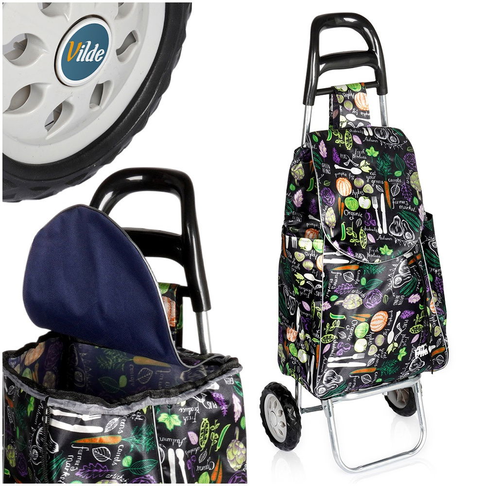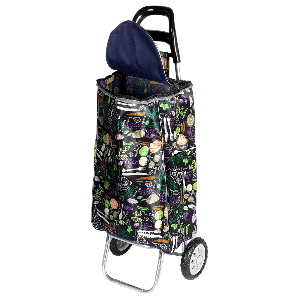 Torba o pojemności 30 l - Torba z wózka wykonana jest z poliestru w czarnym kolorze z efektownym motywem warzyw i ziół. Dla komfortu użytkowania zamykana jest za pomocą sznurka. Posiada również tylną kieszeń, która jest zamykana na zamek.