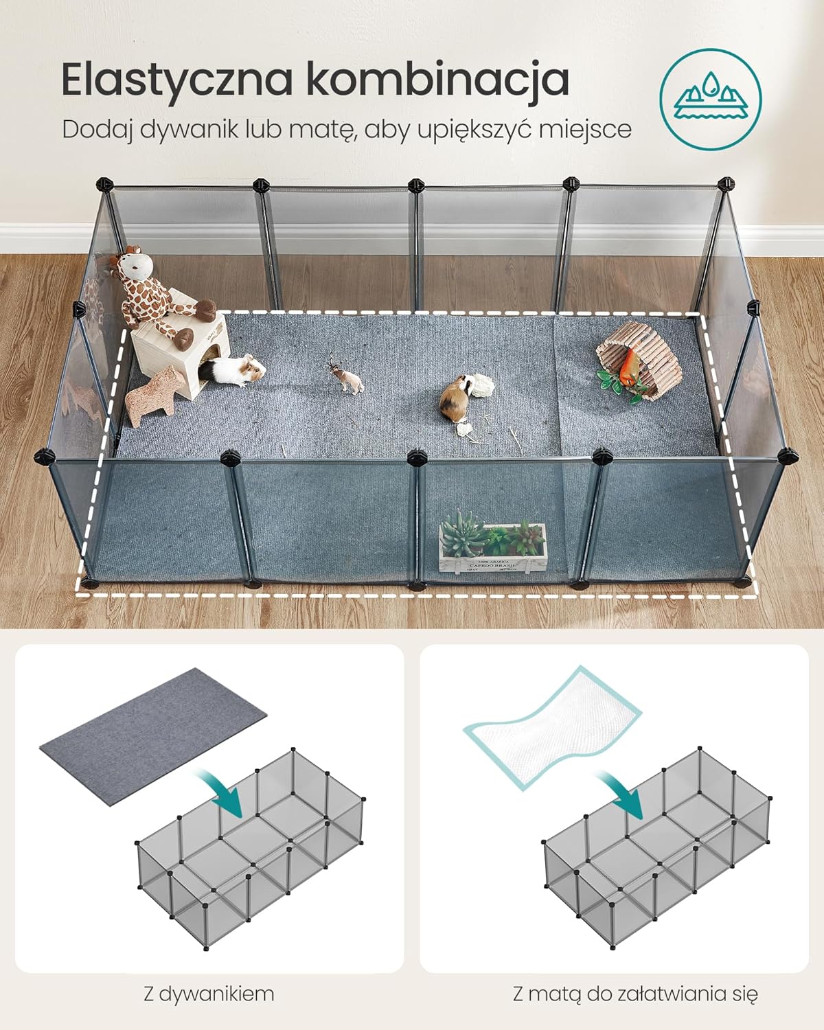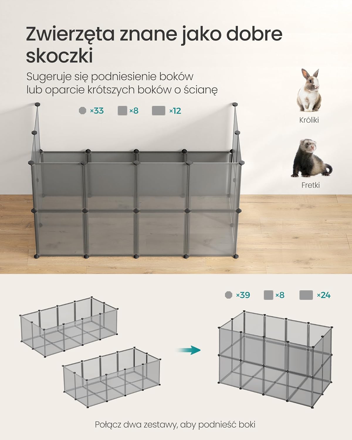 Podaruj swojemu małemu przyjacielowi przestrzeń, której potrzebuje, łącząc bezpieczeństwo z wolnością. Nasz modułowy kojec to idealne rozwiązanie dla właścicieli królików, świnek morskich, jeży, a także małych szczeniąt. Dzięki półprzezroczystym panelom zawsze masz oko na swojego zwierzaka, a on może swobodnie obserwować otoczenie.