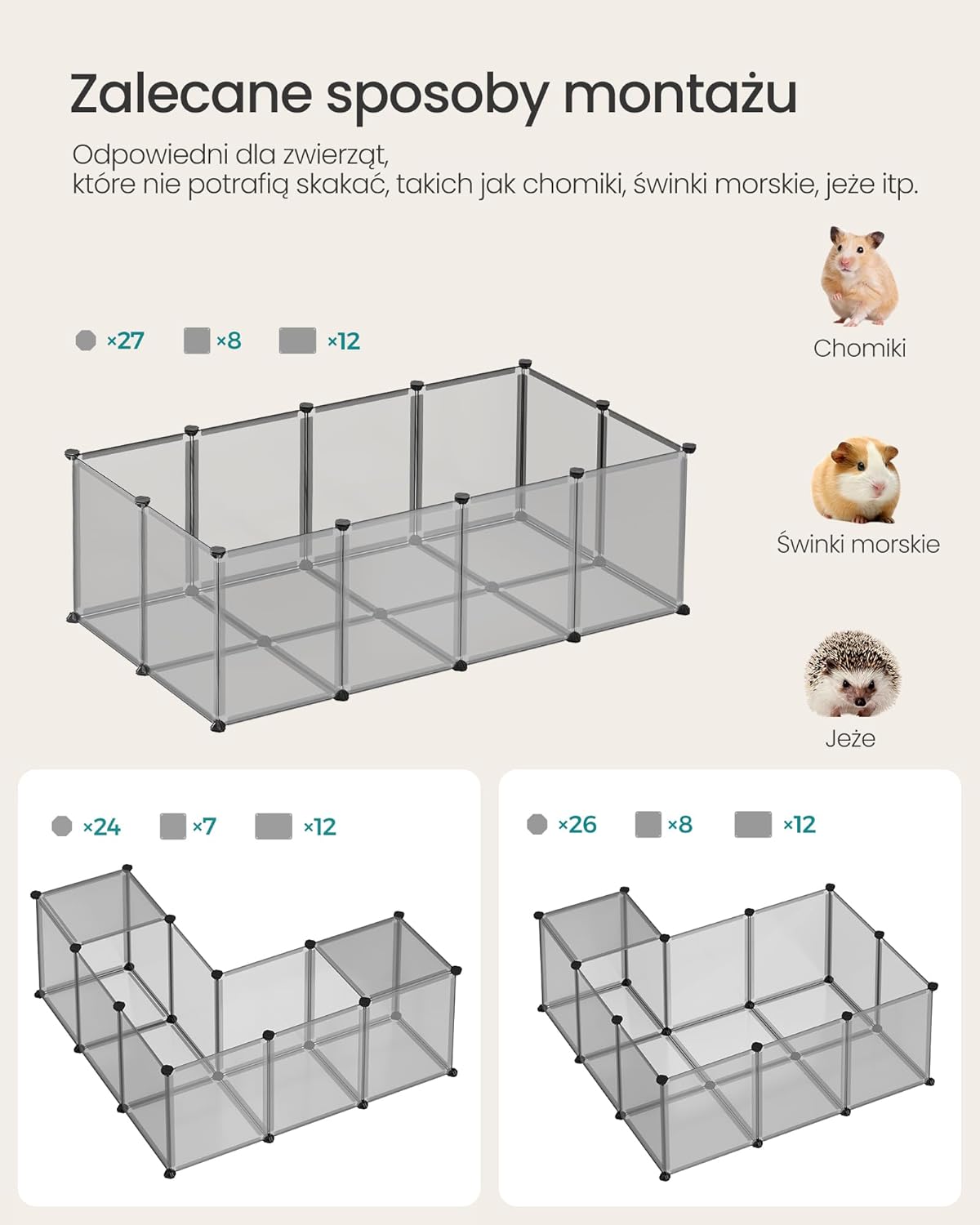 Uwaga: Dzięki modułowej budowie możesz dowolnie modyfikować układ, tworząc wyższy, węższy lub kwadratowy kojec, w zależności od liczby użytych paneli.