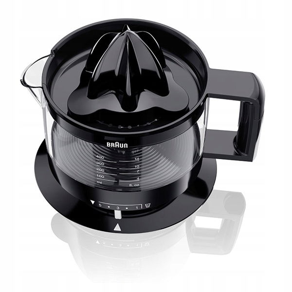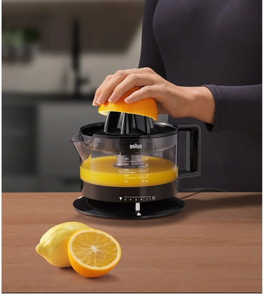 Bez dodatkowych przycisków - wystarczy docisnąć owoc, aby uruchomić wyciskanie lub go podnieść, aby zatrzymać pracę