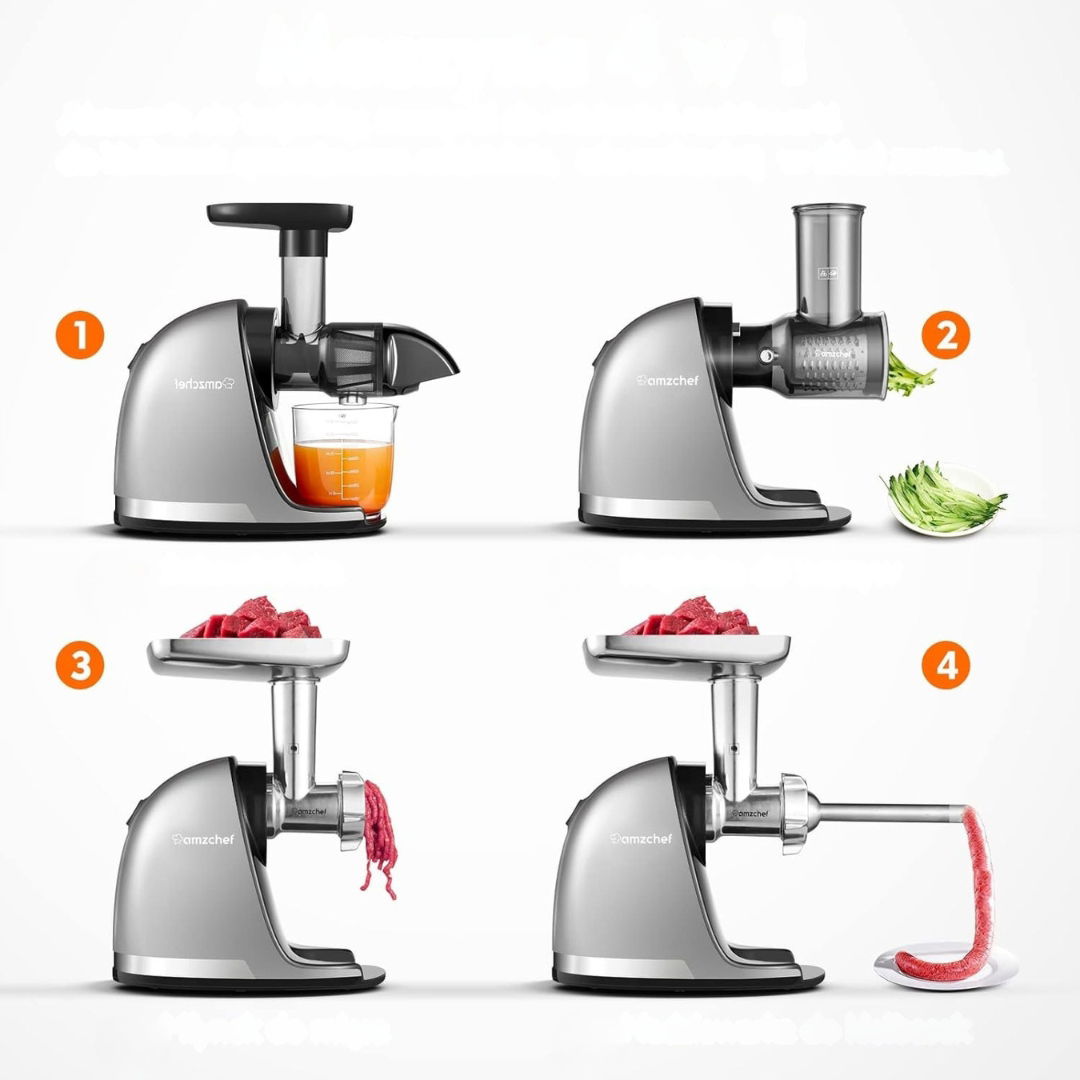 Sokowirówka elektryczna 4 w 1 AMZCHEF to innowacyjne urządzenie do wyciskania soku z owoców i warzyw. Wyposażona w 7-stopniowy ślimak, efektywnie oddziela sok od wytłoków, oferując czysty, pełen smaku napój. Przygotowywanie soków nigdy nie było prostsze i bardziej satysfakcjonujące!