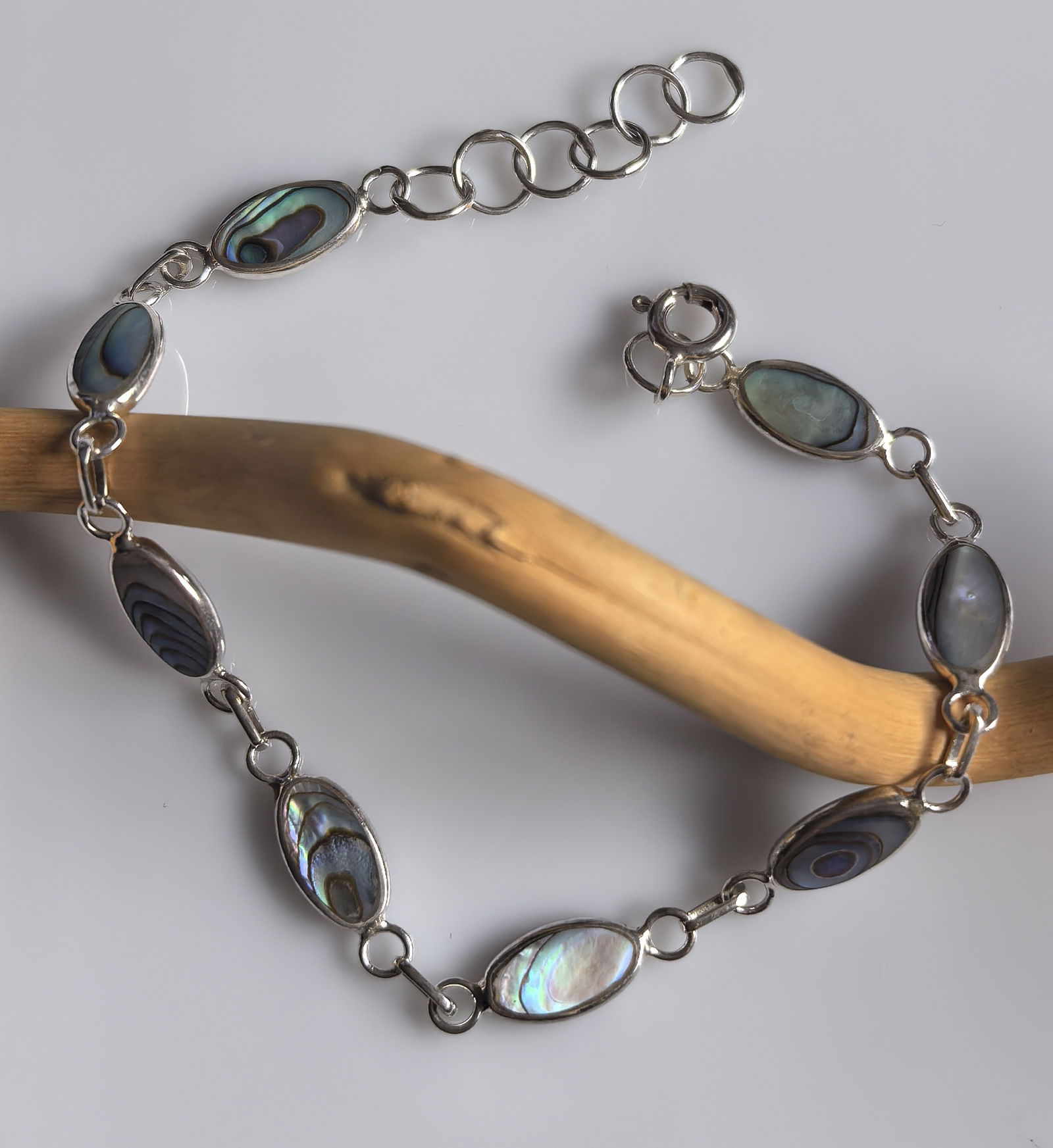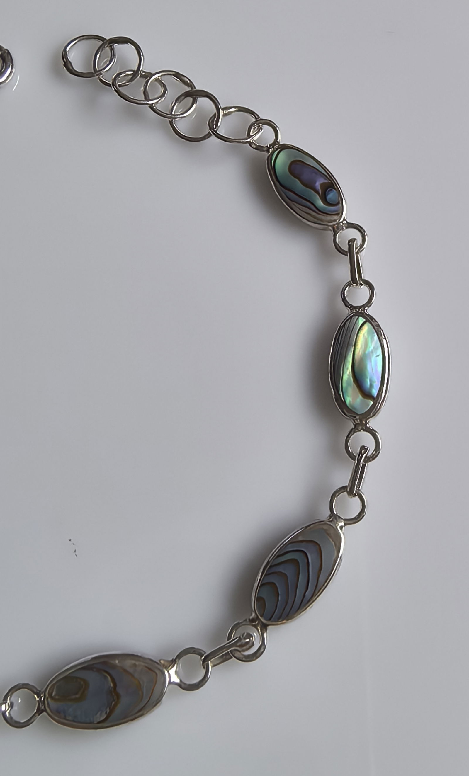 zjawiskowa bransoletka składająca się z ogniw w kształcie łezki, w których osadzono masę perłową o intensywnym, opalizującym połysku – z odcieniami zieleni, błękitu i fioletu