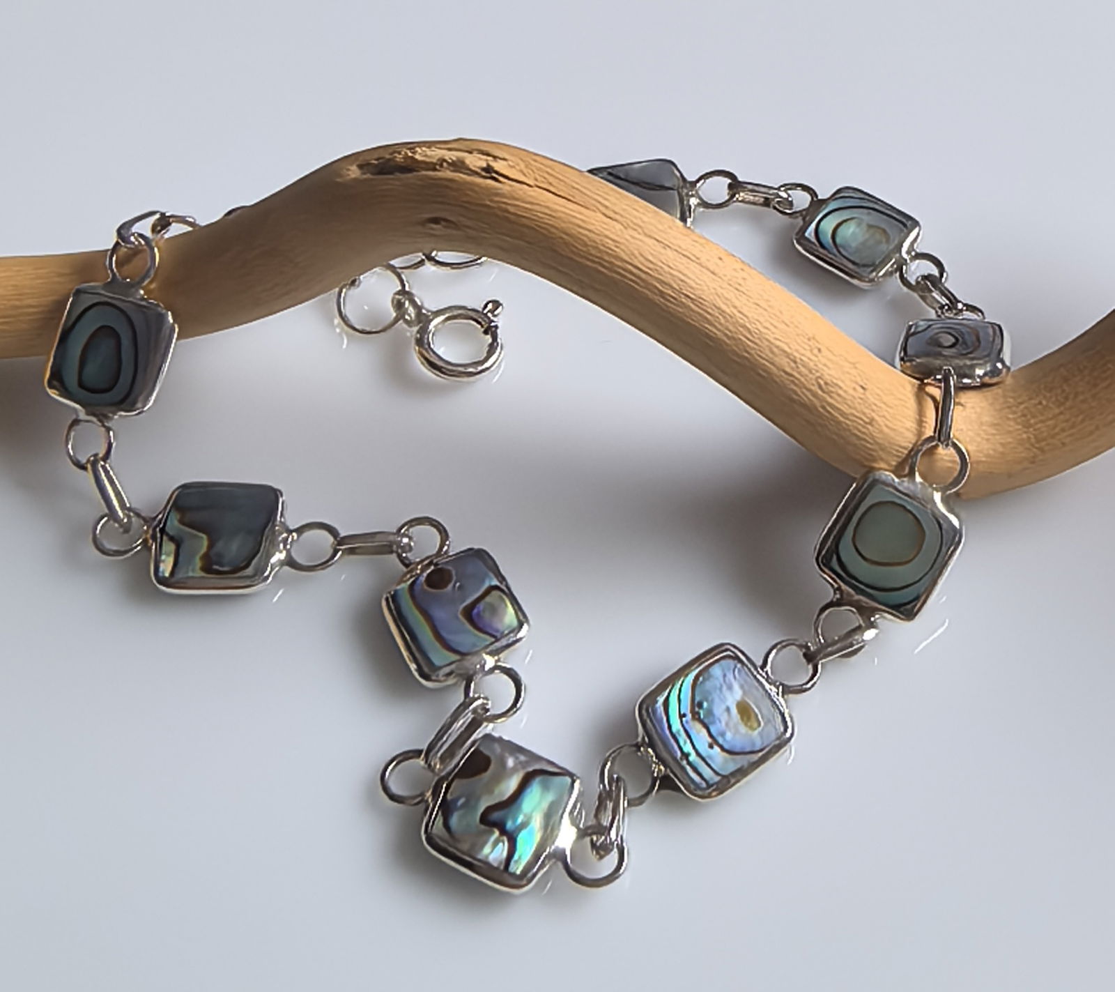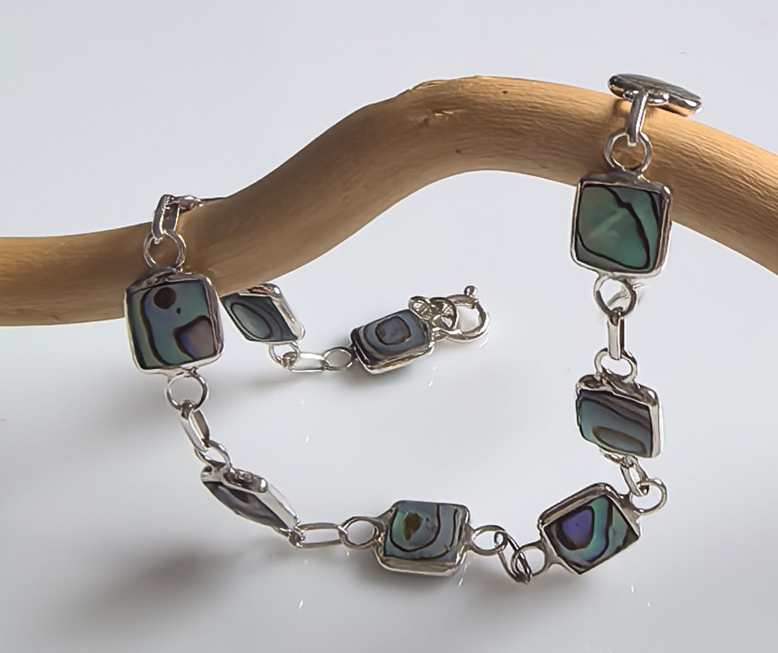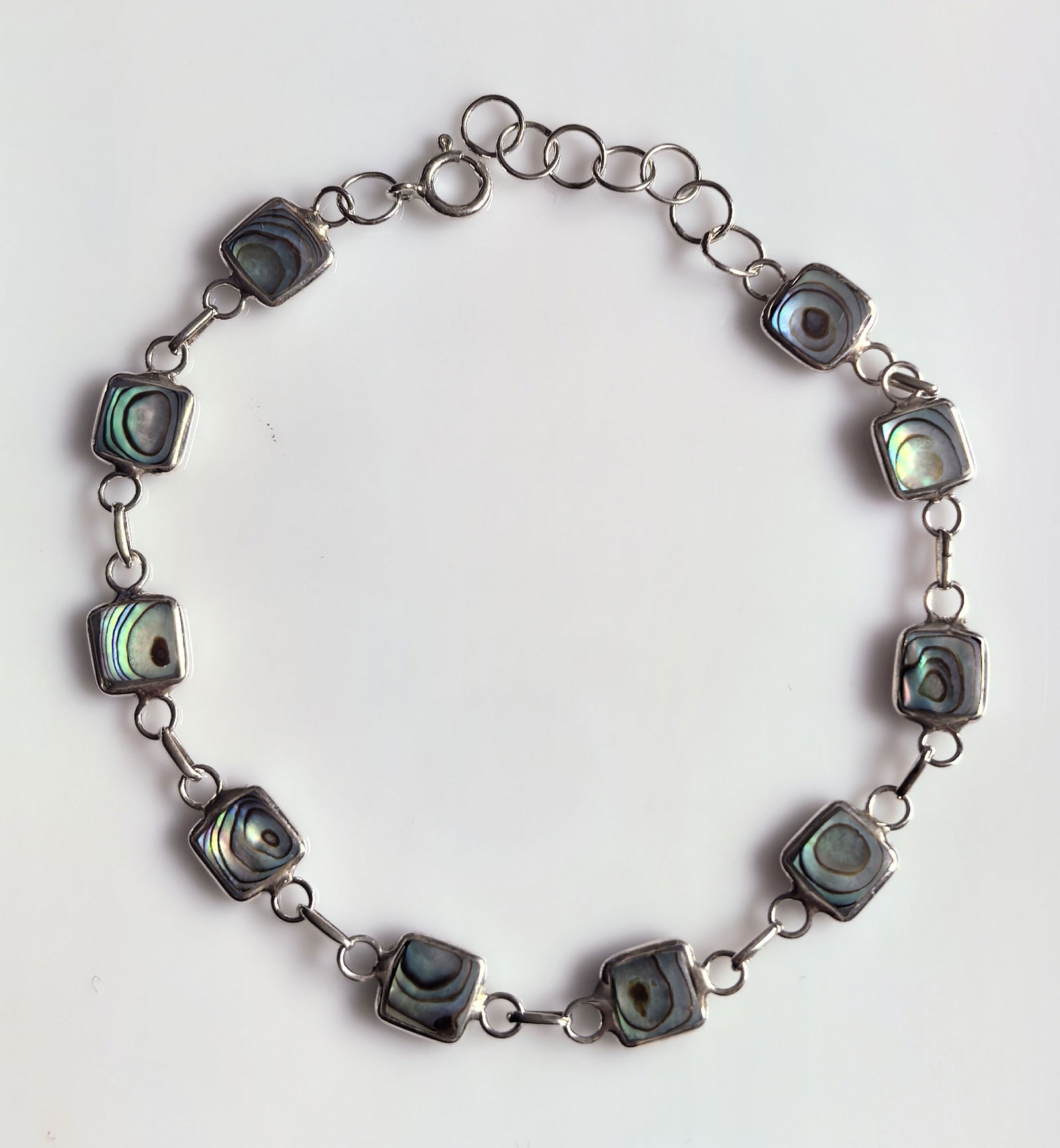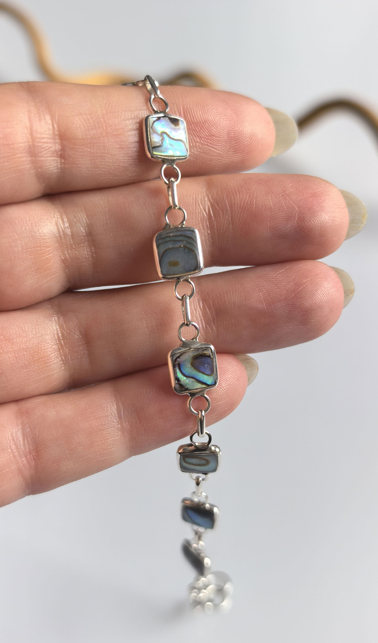 zjawiskowa bransoletka składająca się z kwadratowych ogniw, w których osadzono masę perłową o intensywnym, opalizującym połysku – z odcieniami zieleni, błękitu i fioletu