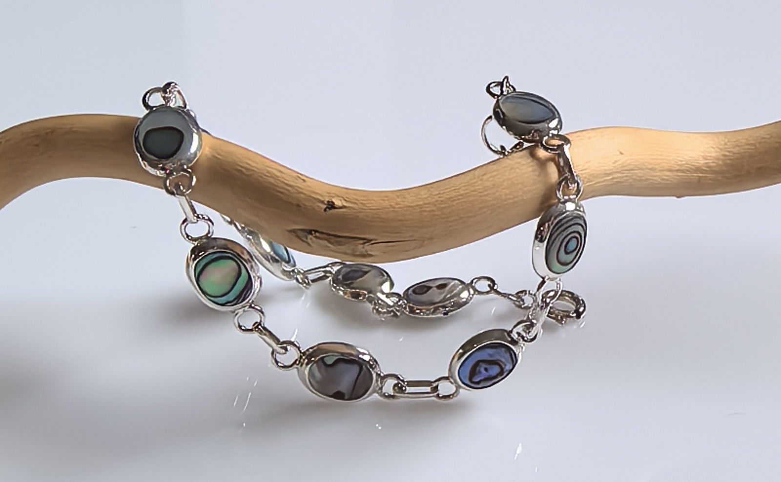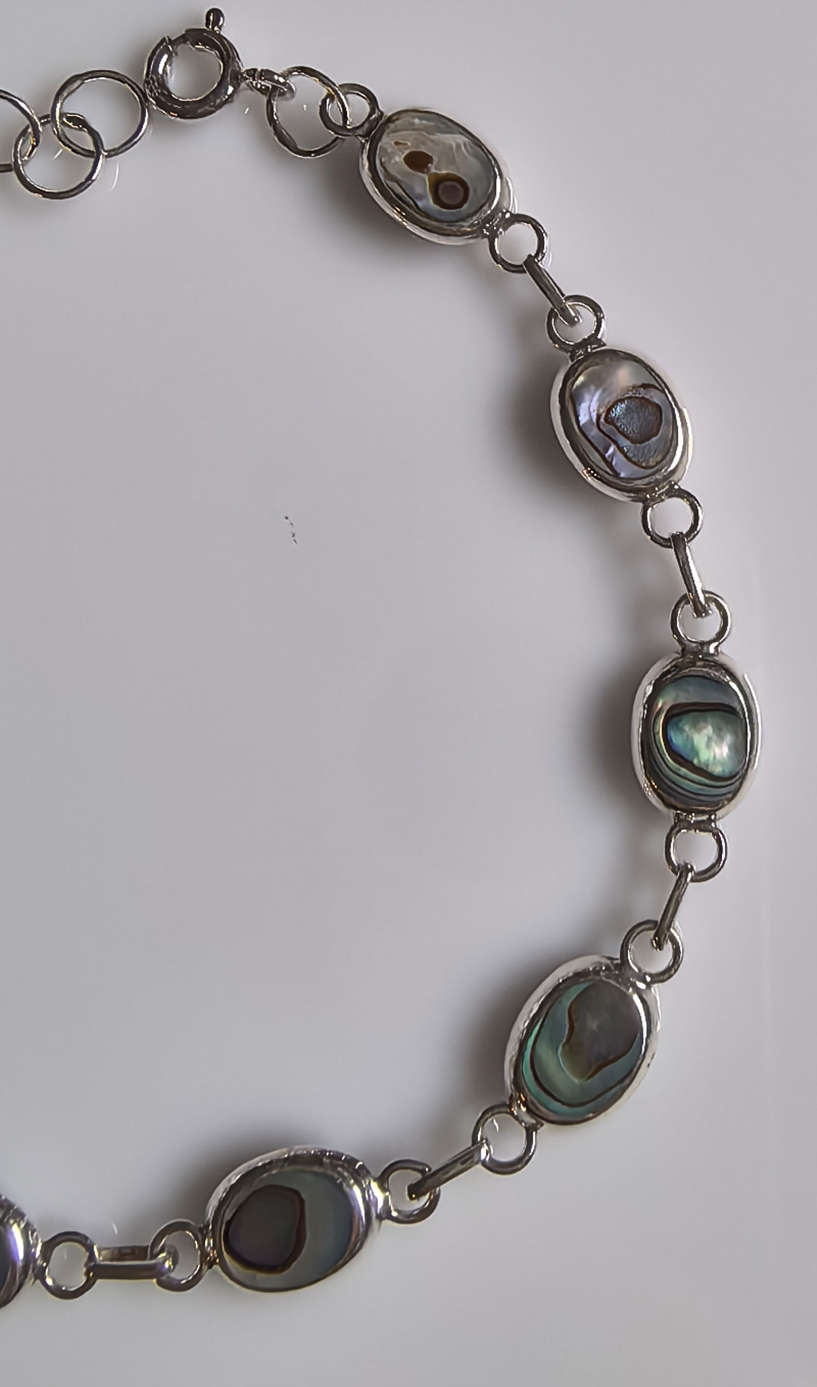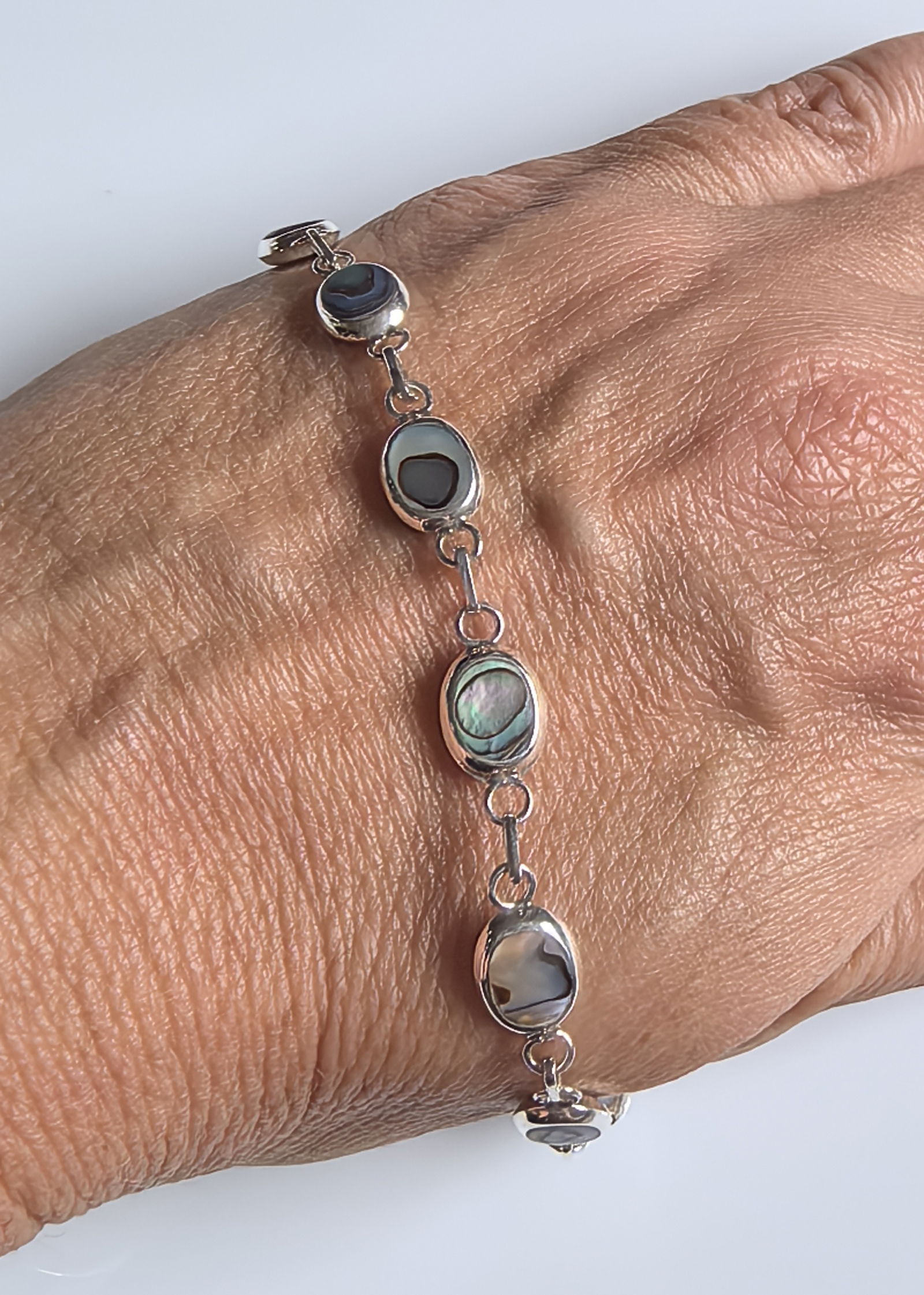 zjawiskowa bransoletka składająca się z owalnych ogniw, w których osadzono masę perłową o intensywnym, opalizującym połysku – z odcieniami zieleni, błękitu i fioletu