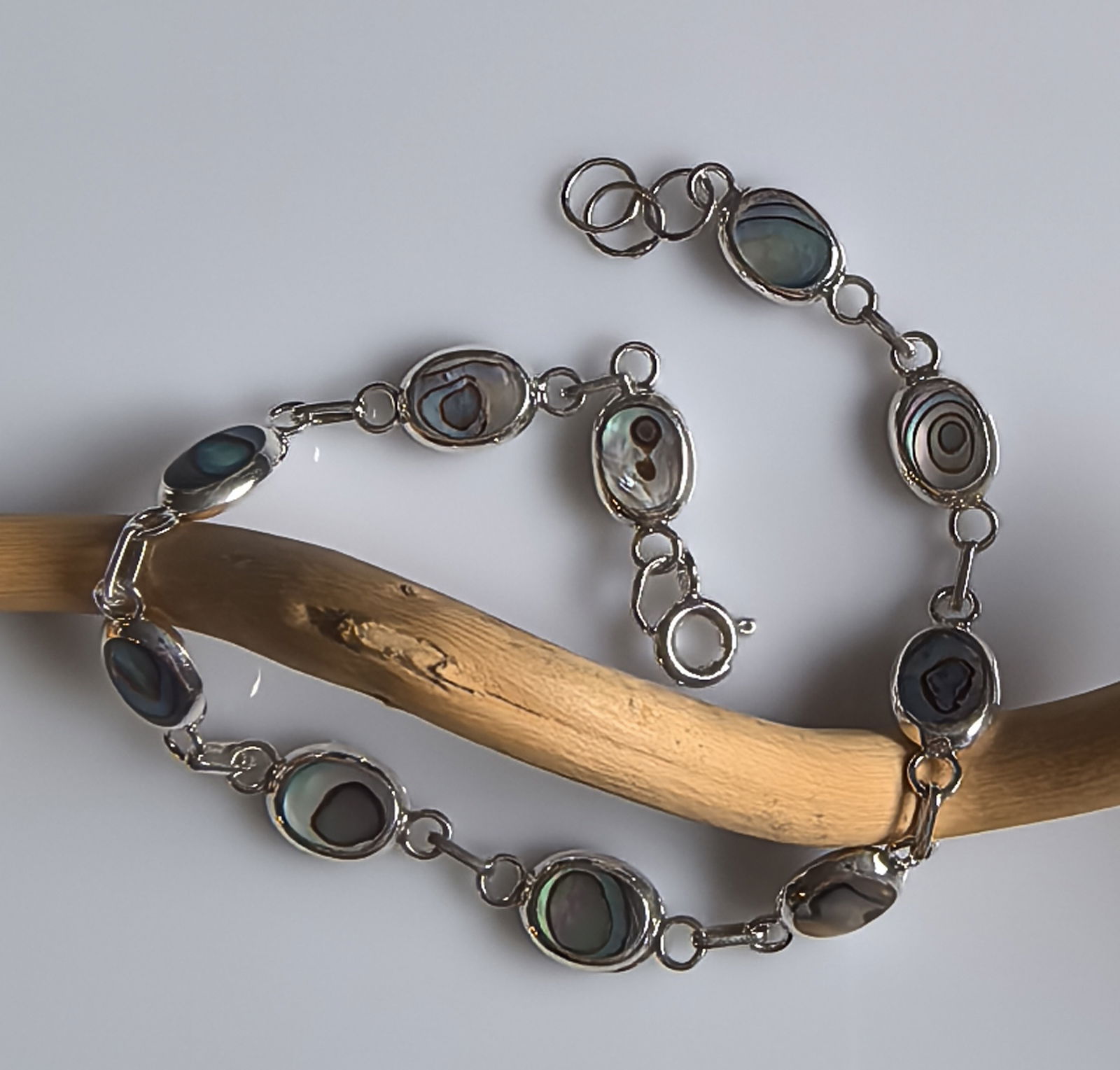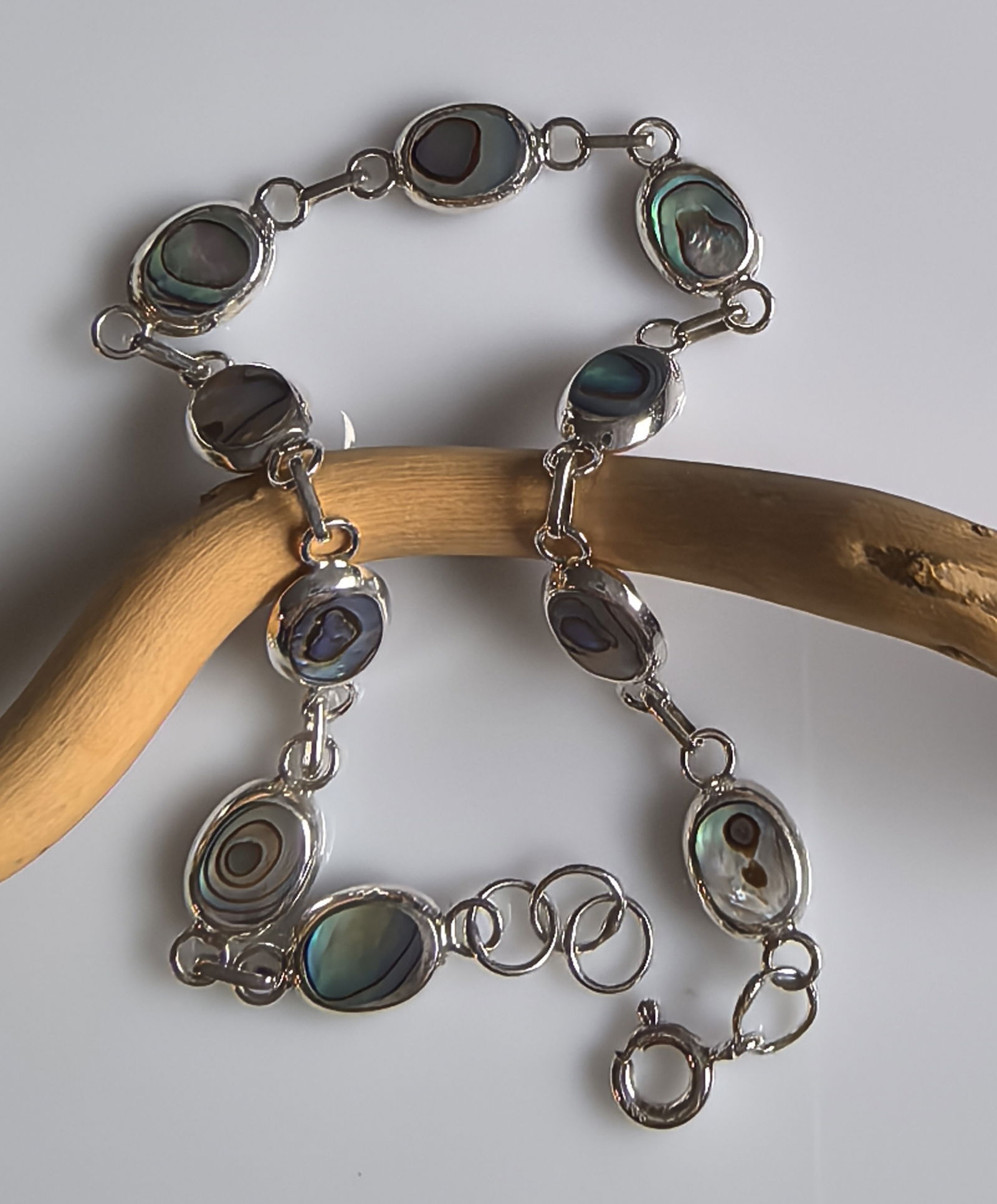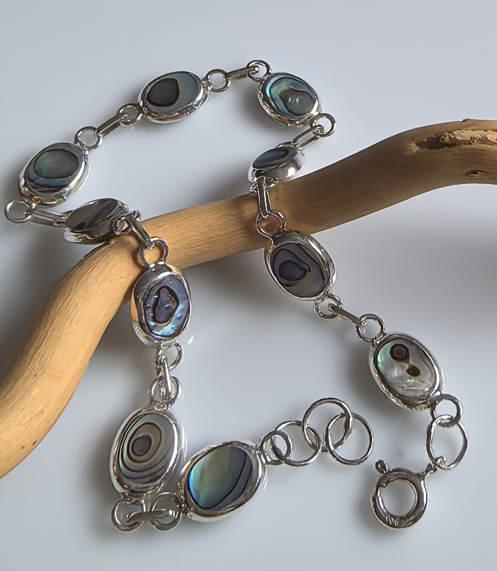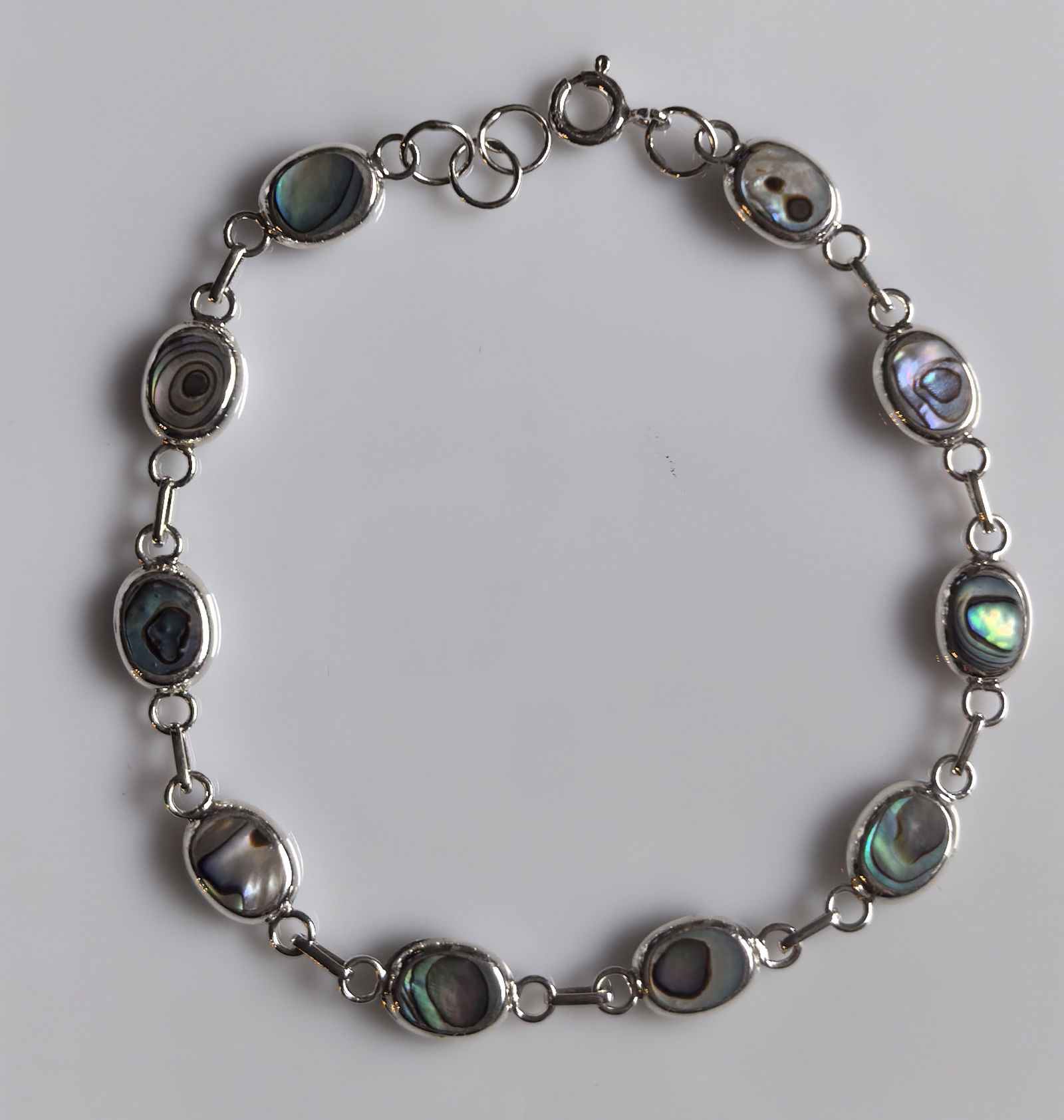 zjawiskowa bransoletka składająca się z owalnych ogniw, w których osadzono masę perłową o intensywnym, opalizującym połysku – z odcieniami zieleni, błękitu i fioletu