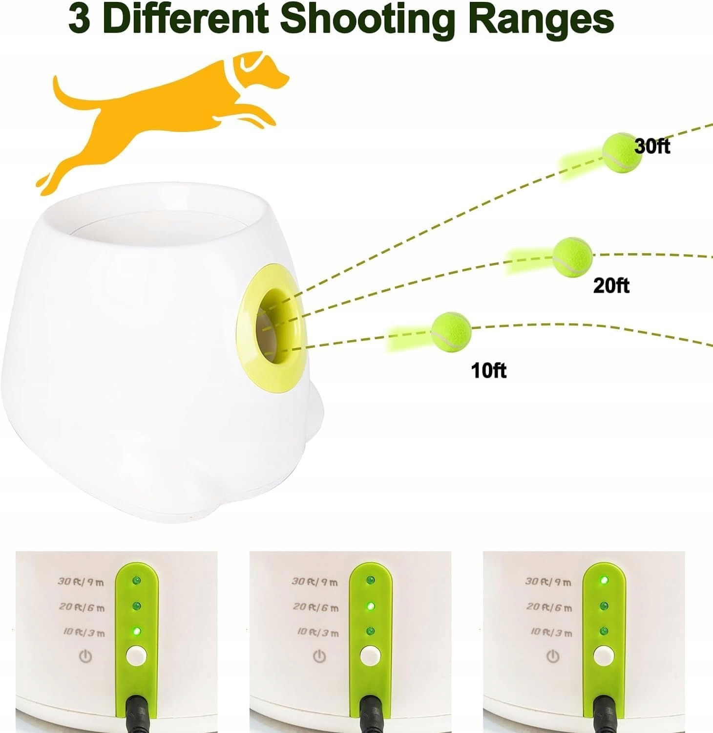 Regulowana odległość wyrzutu: Wyrzutnia piłek może wystrzelić kulę na odległość 10, 25 lub 40 stóp, co można łatwo zmienić za naciśnięciem jednego przycisku.