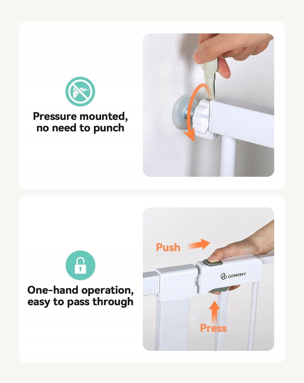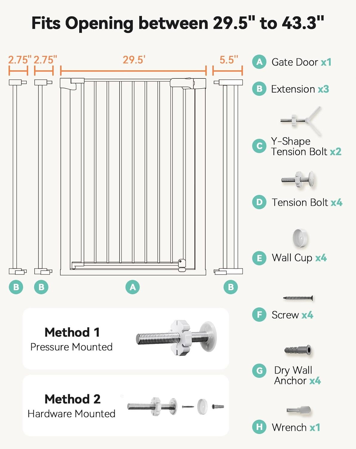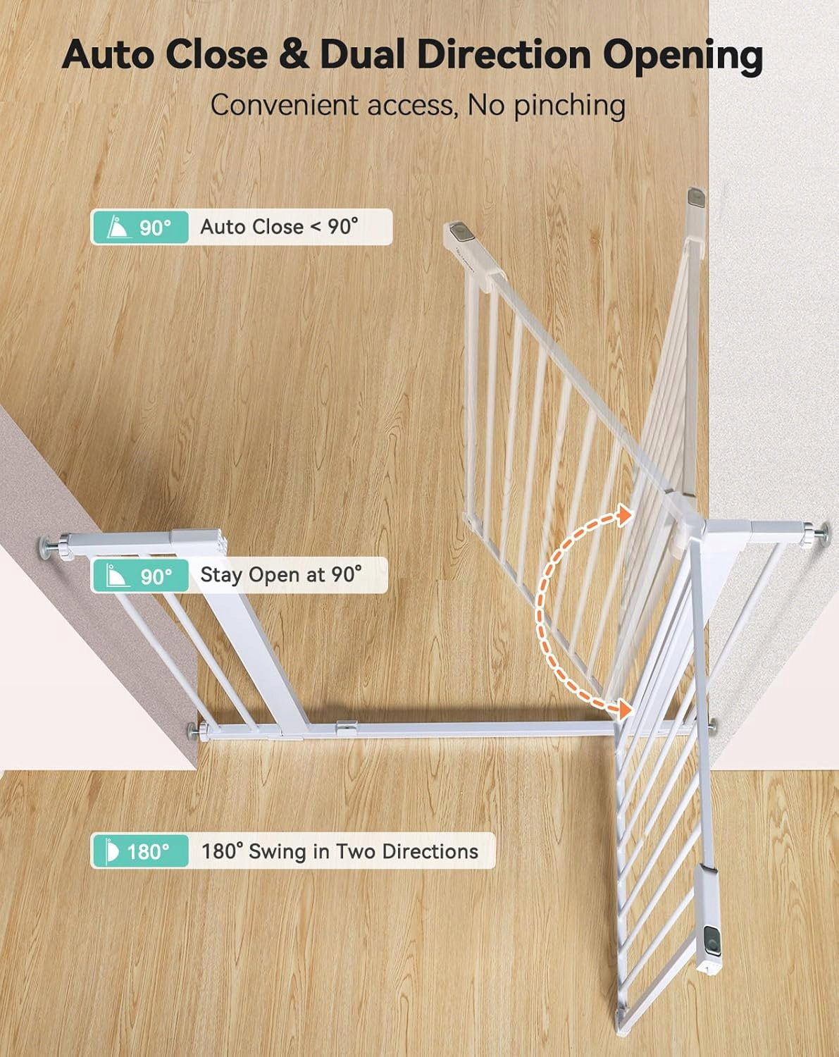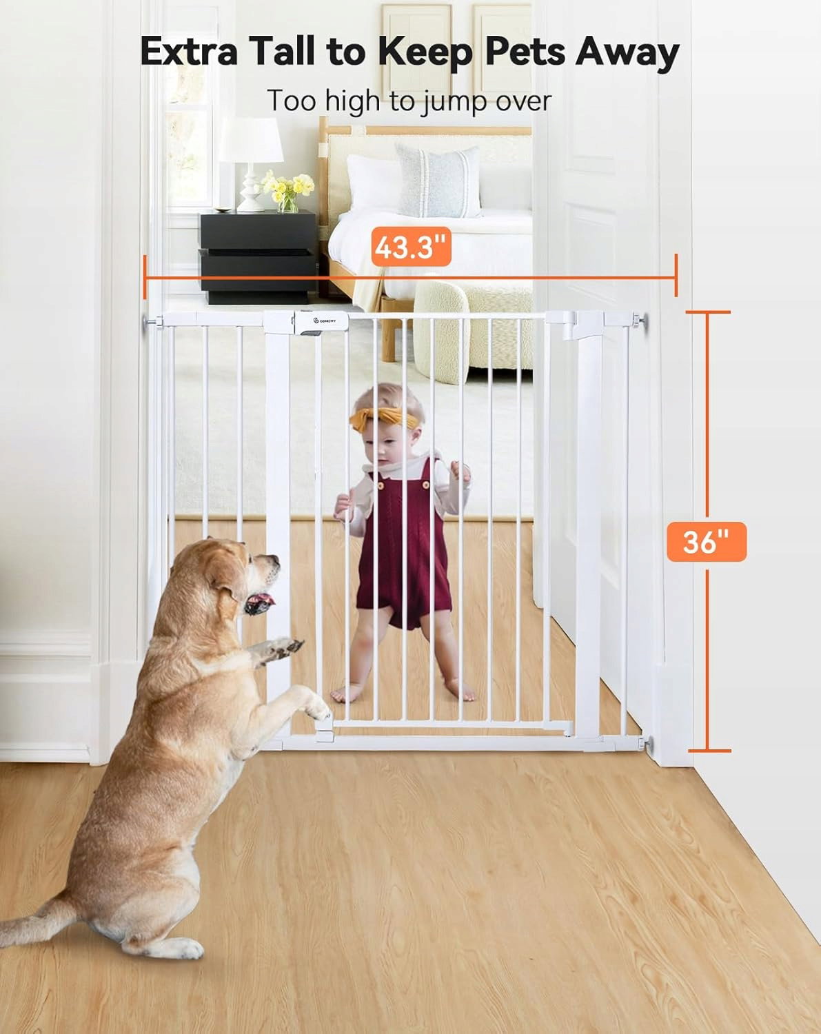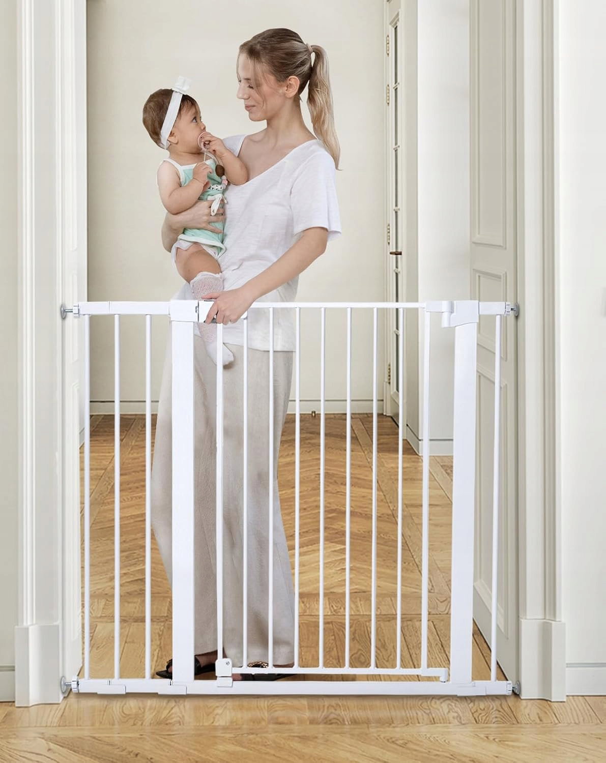 Ta bardzo wysoka kratka ochronna została zaprojektowana z myślą o maksymalnym bezpieczeństwie niemowląt i małych dzieci. O wysokości 91 cm oraz regulowanej szerokości od 75 cm do 110 cm, idealnie pasuje do schodów, drzwi oraz innych przejść. Dzięki automatycznemu zamykaniu i łatwemu montażowi bez wiercenia, bramka łączy w sobie bezpieczeństwo, funkcjonalność i elegancki wygląd.