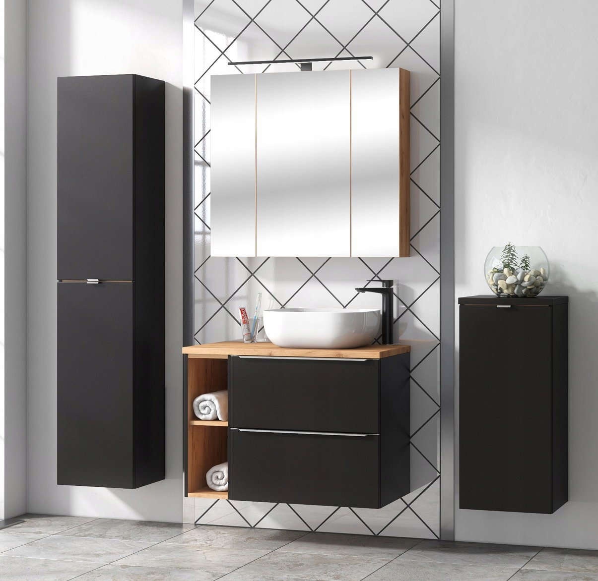 Wyjątkowość kolekcji CAPRI CZARNY MAT wynika przede wszystkim z połączenia prostej i stonowanej formy z pięknym dekorem pozwalając stworzyć harmonijne, eleganckie wnętrze. Połączenie czarnych korpusów i frontów wraz z dębowym wnętrzem szafek nadaje kolekcji unikalnego charakteru. Geometryczną formę mebli podkreślają krawędziowe uchwyty. Komfort użytkowania podnoszą zastosowane w szufladach prowadnice i zawiasy z funkcją cichego domyku, dzięki którym zamykają się one cicho i łagodnie. Nowoczesnym akcentem w tej kolekcji jest opcja dodania oświetlenia do szuflad w szafkach pod umywalkę.