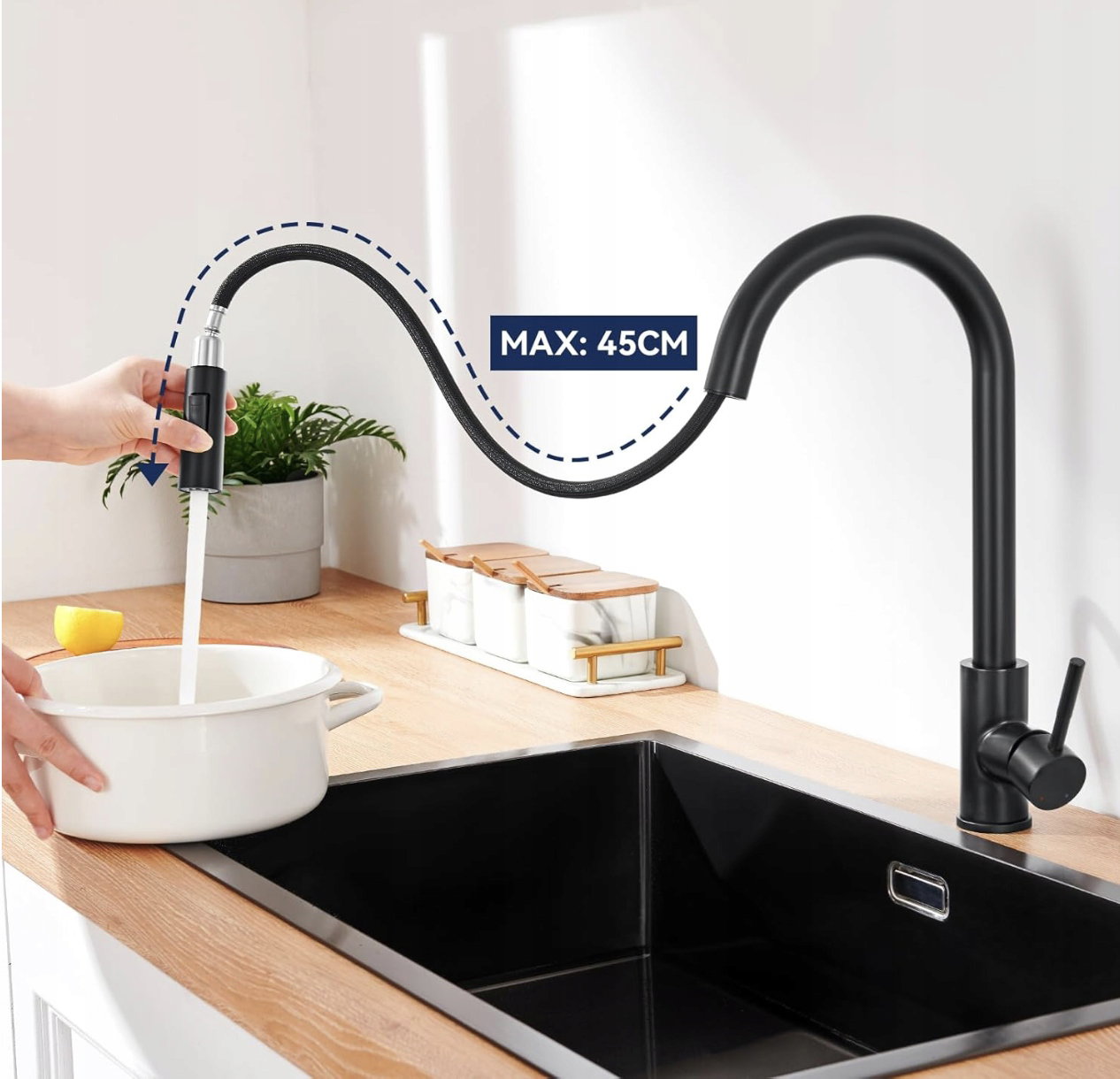 Kran z wyciągana wylewką ma zasięg 50 cm. Dzięki wysuwanemu kranowi kuchennemu można łatwo dotrzeć do wszystkich narożników zlewozmywaka i napełnić garnki bezpośrednio na miejscu gotowania, szczególnie nadaje się do kuchni z dużymi zlewozmywakami lub podwójnymi zlewozmywakami.
