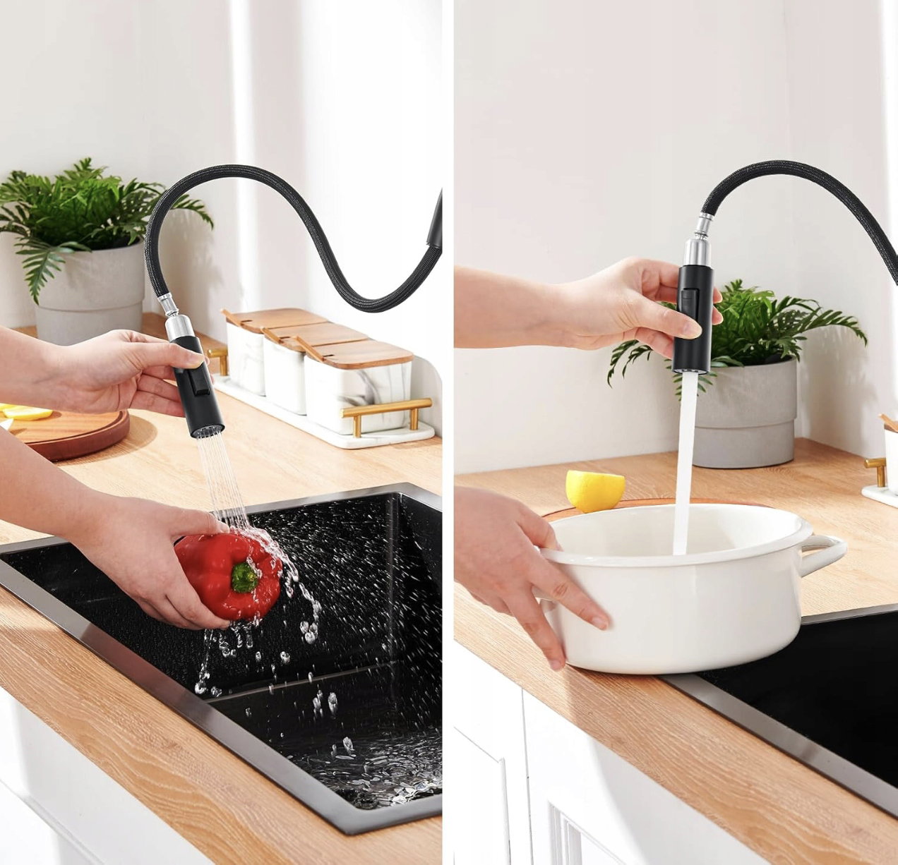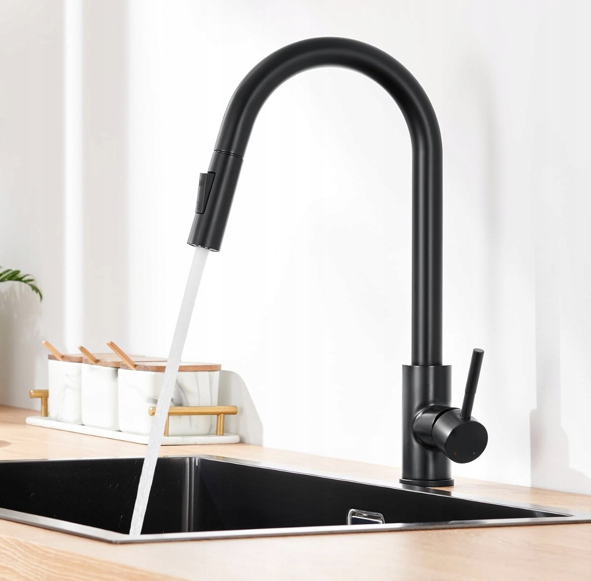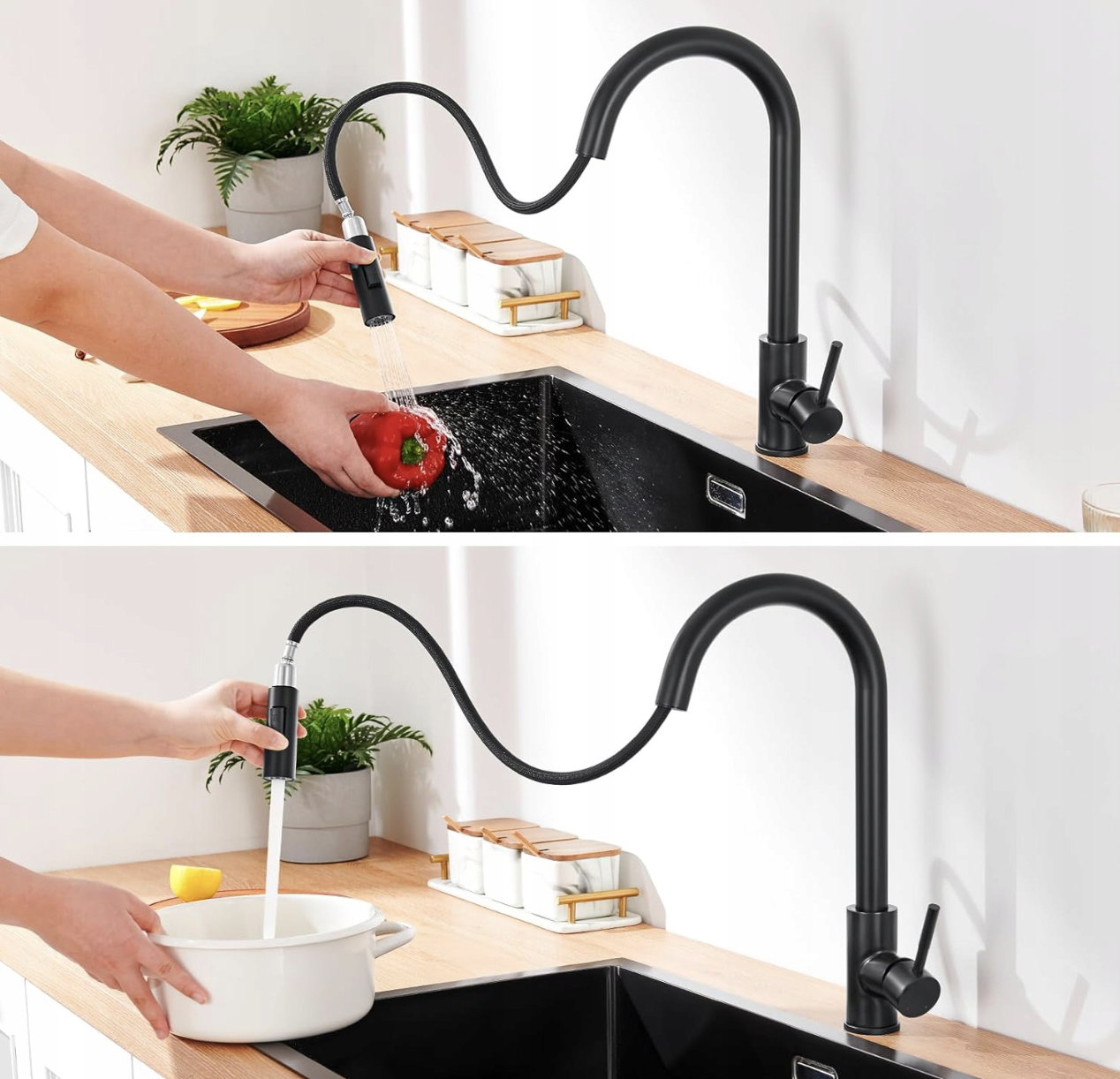 Kran czarny jest wyposażony w 2 rodzaje strumienia: