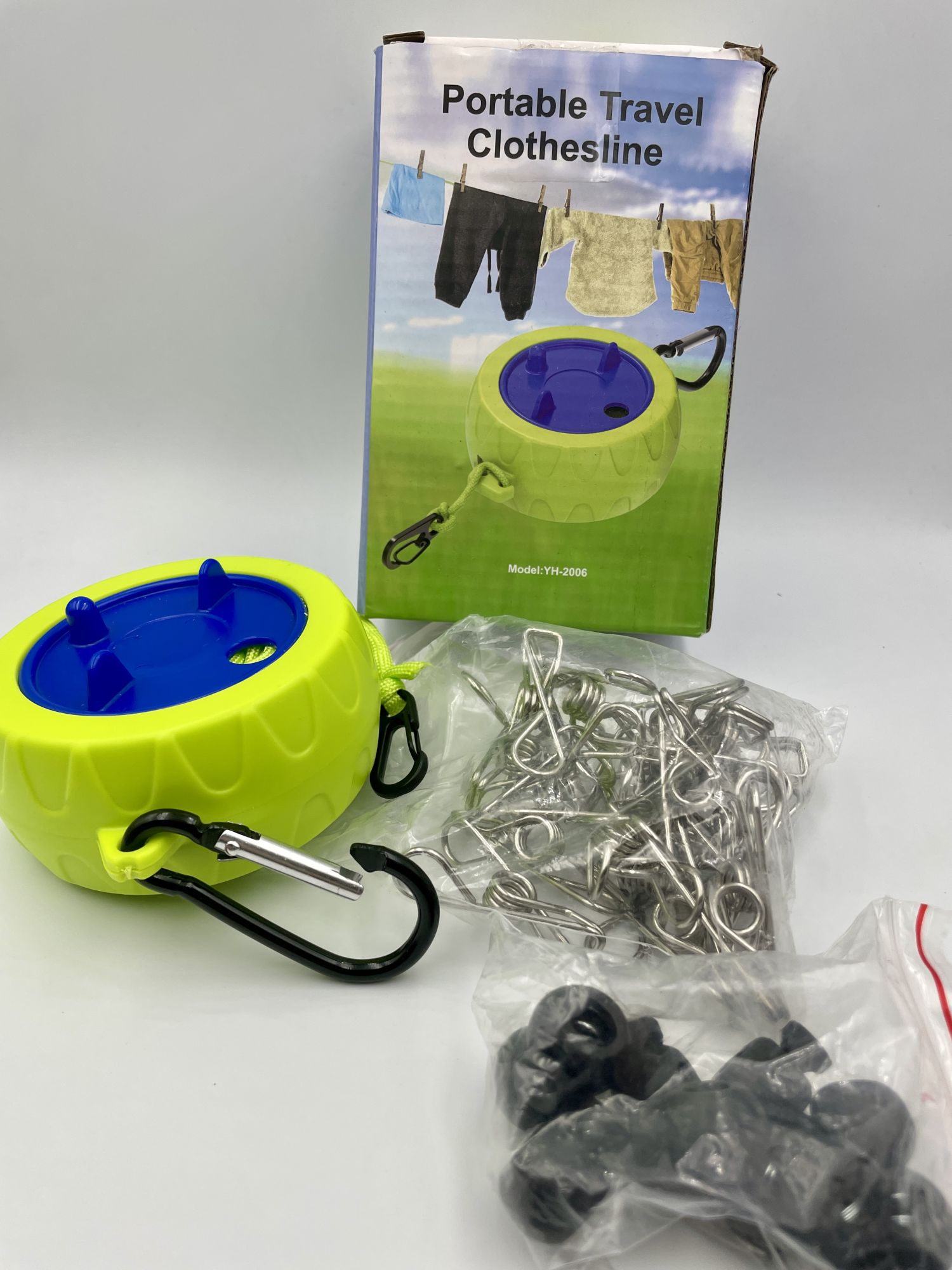 - W zestawie: wysuwana linka z karabińczykiem (popsuty zacisk, linkę można przywiązać lub zmienić karabińczyk), 16 sztuk metalowych spinaczy, 8 sztuk plastikowych regulatorów długości)