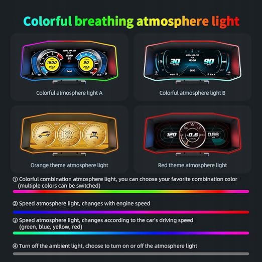 Dynamiczny system alarmowy: Bezpieczeństwo jazdy jest najważniejsze. HUD P4 posiada inteligentne okno alarmowe, które natychmiast uruchamia alarm w przypadku wykrycia nieprawidłowości podczas jazdy. Wyświetlacz OBD2 pokazuje odpowiednie symbole ostrzegawcze i parametry, którym towarzyszą ostrzeżenia akustyczne dla 12 alarmów krytycznych, w tym nadmierne obroty na minutę, ciśnienie oleju, obroty na minutę, ostrzeżenia o temperaturze i nie tylko