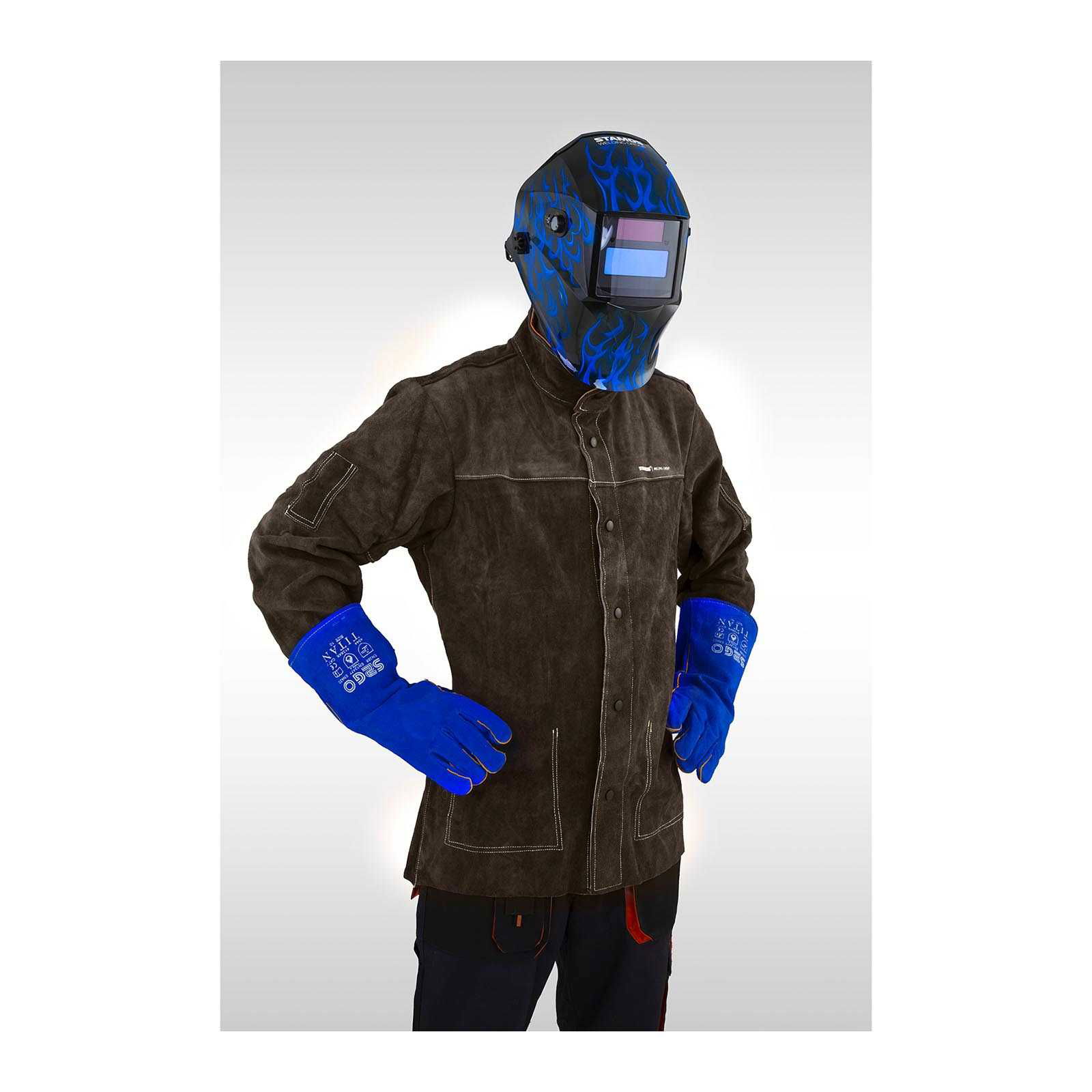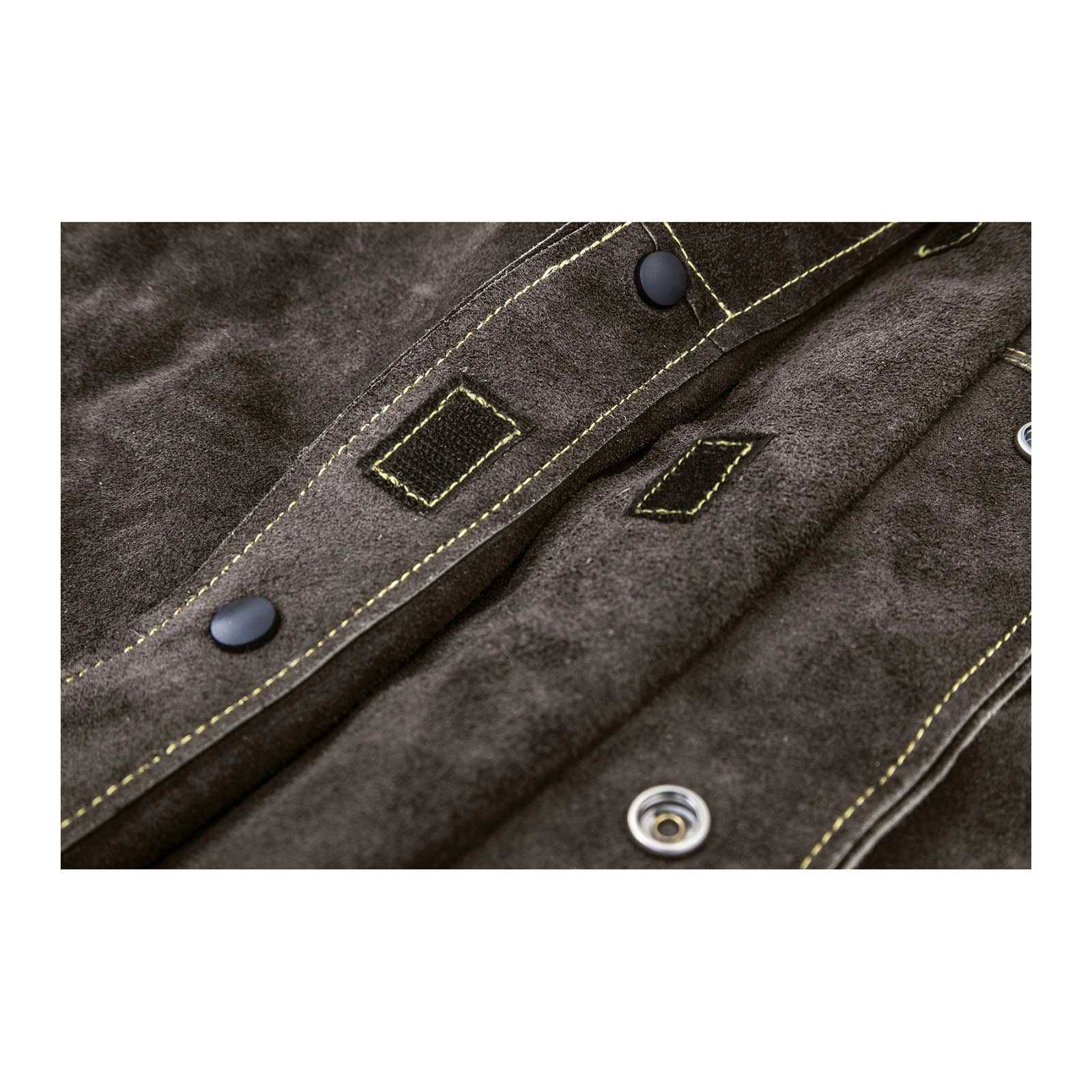 Numer producenta: 10020609Wytrzymała kurtka spawalnicza w rozmiarze L została zaprojektowana z myślą o ochronie spawacza podczas pracy. Wykorzystanie wysokiej jakości dwoiny bydlęcej gwarantuje odporność na ścieranie oraz wytrzymałość na ciepło. Materiał zszyto specjalnymi nićmi KEVLARreg , które są niepodatne na wysoką temperaturą i płomienie.Wykorzystanie skóry bydlęcej oraz przemyślany projekt, zapewniają komfortowe noszenie kurtki. Zawijany kołnierz ze sztywną podszewką pozwala na skuteczną ochronę szyi przed wiatrem. Produkt jest zapinana na zatrzaski, które zostały zaizolowane w celu ochrony przed porażeniem prądem. Dla wygody spawacza, w kurtce umieszczono dwie wewnętrzne kieszenie służące do przechowywania np. narzędzi, czy części. Kurtka jest zgodna z normą EN ISO 11611:2015 oraz posiada klasę ochrony 2 i ochronę przed ogniem A1. Zapobiega uszkodzeniu ciała przez iskry, odpryski, krótki kontakt z ogniem oraz zmniejsza ryzyko porażeniem prądem o napięciu do 100 V DC.Cechy produktu: