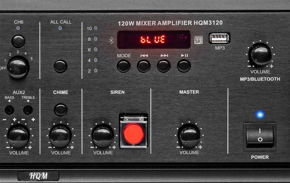 Wzmacniacz miksujący PA HQM3120 120W to nowoczesne urządzenie audio stworzone z myślą o realizacji niezawodnych systemów nagłośnienia. Sygnowany logiem HQM (High Quality Music) należy do części innowacyjnej serii produktów, umożliwiających niezawodną oraz nowoczesną prace w dostarczaniu dźwięku. Zastosowana w centrali wystarczająca moc wyjściowa oraz wyjścia z podziałem na 6 strefy głośników, pozwolą na zasilenie średnich i dużych systemów nagłaśniających. Urządzenie cechuje się prostą obsługą, bezawaryjną pracą oraz solidnym wykonaniem. Dodatkową zaletą wzmacniacza HQM-3120 jest wbudowany odtwarzacz MP3 oraz Bluetooth z wyświetlaczem LED.