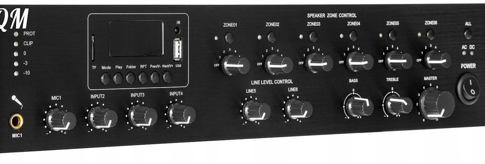 Solidny wzmacniacz HQM4240WF/DA / HQM4240/MT marki High Quality Music przystosowany został do emisji zarówno dźwięków muzycznych, jak i komunikatów głosowych. Urządzenie wyposażone zostało w 4 wejścia mikrofonowe z funkcją priorytetu na wejściu pierwszym (MIC1) oraz 5 wejść liniowych. Dodatkowo do zapewnienia wszelkiej kontroli nagłaśnianych obiektów profesjonalny wzmacniacz HQM4240WF/DA posiada szereg regulacji, pozwalających na kalibrację: głośności, niskich i wysokich tonów urządzenia oraz głośności poszczególnych komponentów podłączonych do końcówki mocy.