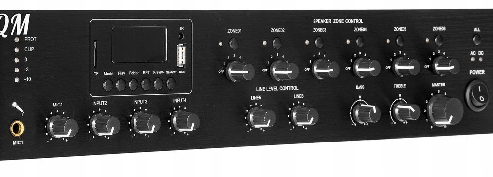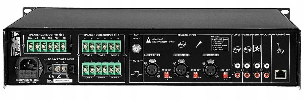 - wyjścia linii głośnikowych: 4~16Ω, 70V, 100V
