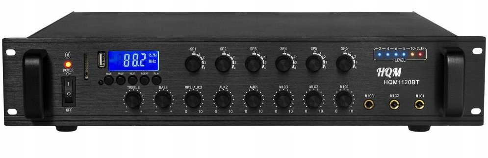 HQM 1120BT 120W to wysokiej jakości wzmacniacz radiowęzłowy, cechujący się niezawodnością pracy i klarownym brzmieniem. Wykorzystywany do tworzenia nowoczesnych systemów nagłośnienia audio. Ponadto, zastosowano wysoce wydajny układ wzmacniający sygnał, co zapewnia podział na 5 stref. Odznacza się solidną pracą, a także prostotą w obsłudze. Posiada wbudowany odtwarzacz MP3 z wyświetlaczem LED oraz tuner radiowy AM/FM. Ponadto, dołączony pilot z klawiaturą numeryczną pozwala na ręczne wyszukiwanie stacji nadawczych.