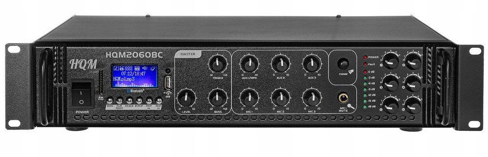 Wzmacniacz PA HQM2060BC to wysokiej jakości urządzenie, zaprojektowane do celów realizacji profesjonalnych systemów nagłaśniania audio. Sygnowany logiem HQM (High Quality Music) należy do części innowacyjnej serii produktów, umożliwiających niezawodną oraz nowoczesną prace w dostarczaniu dźwięku. Zastosowana w centrali wystarczająca moc wyjściowa oraz wyjścia z podziałem na 6 niezależnych stref głośników, pozwolą na zasilenie małych i średnich systemów nagłaśniających. Urządzenie cechuje się prostą obsługą, bezawaryjną pracą oraz solidnym wykonaniem. Dodatkową zaletą wzmacniacza HQM 2060 BC jest wbudowany odtwarzacz MP3 z wyświetlaczem LCD.